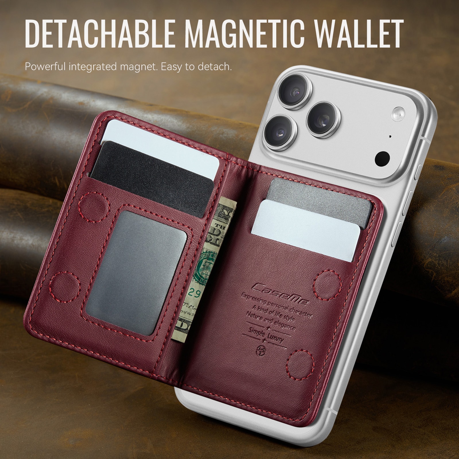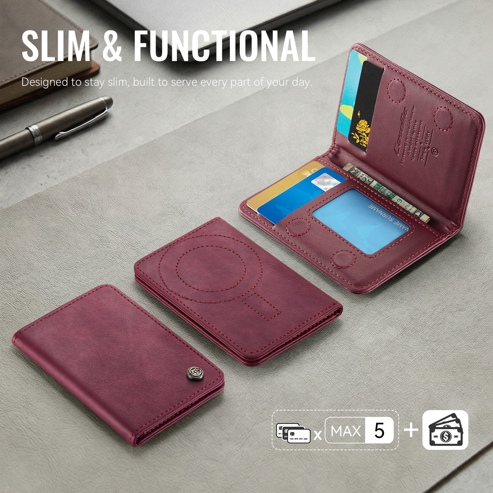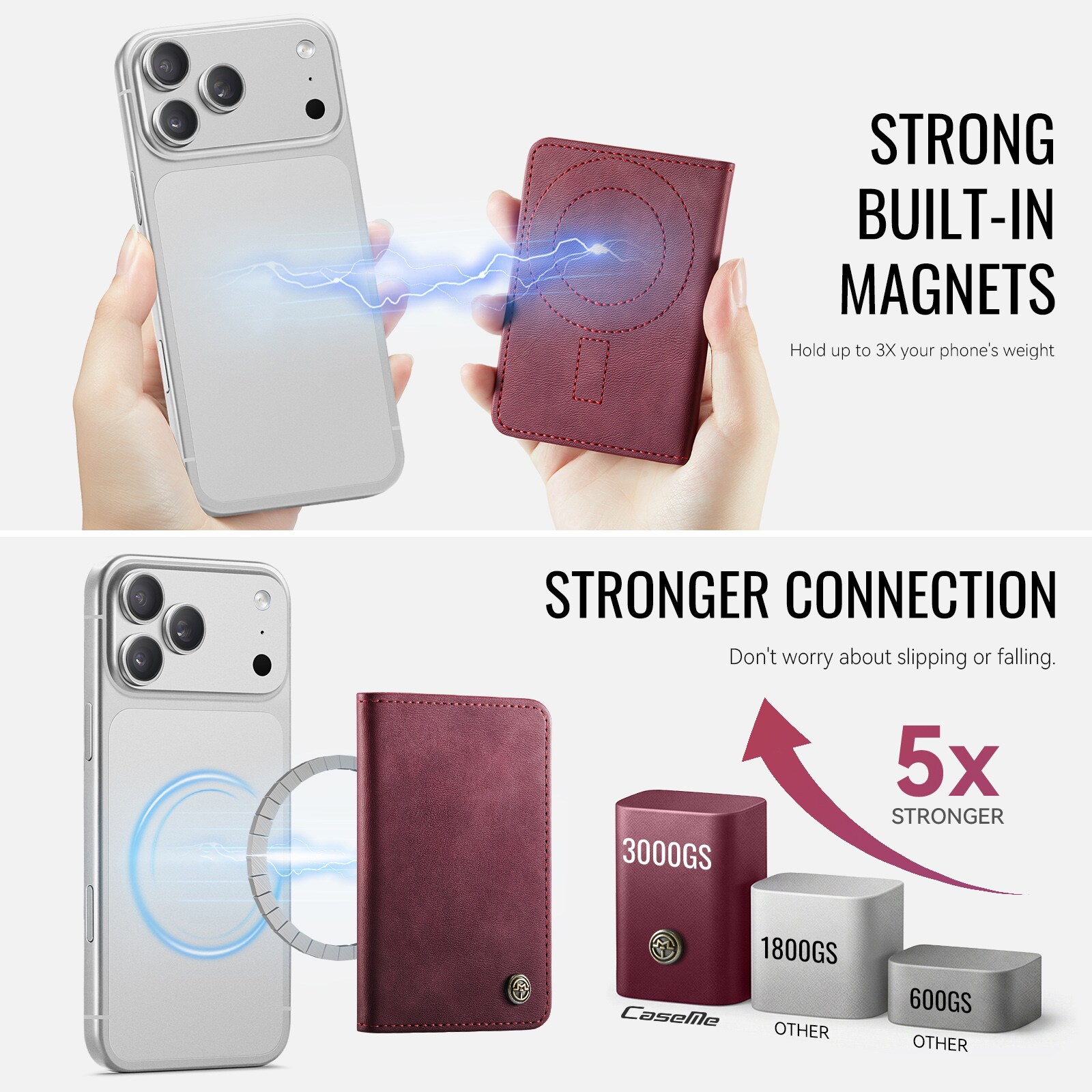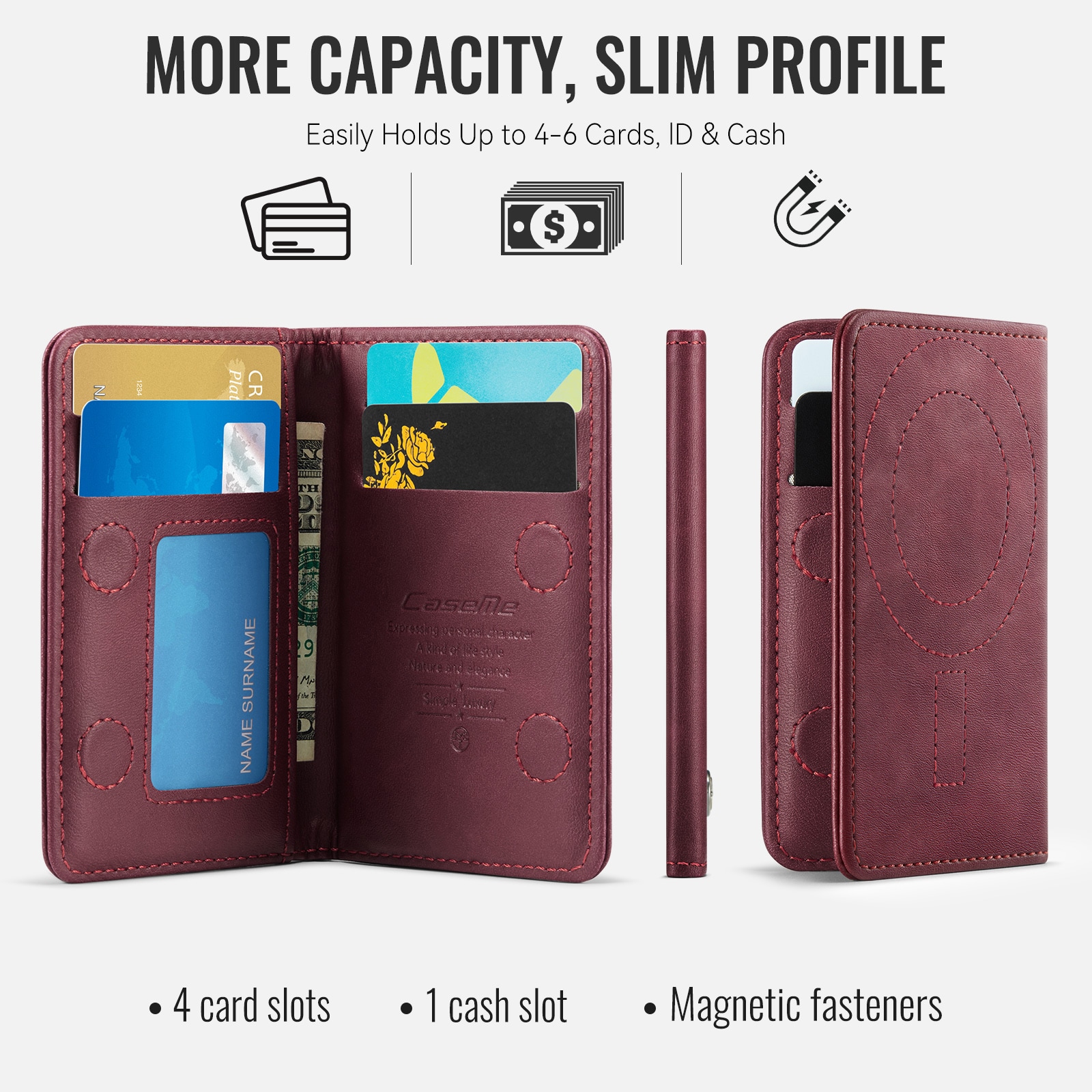 MagSafe leren portemonnee met slank design en praktische standaardfunctie van CaseMe. Deze stijlvolle en compacte kaarthouder biedt ruimte voor maximaal 4 kaarten en contant geld en functioneert tegelijkertijd als een handige telefoonstandaard voor handsfree gebruik. Perfect voor het bekijken van video’s, bellen of surfen zonder je telefoon vast te houden. Met ingebouwde RFID-bescherming blijven je kaarten en persoonlijke gegevens veilig tegen ongeautoriseerd scannen.