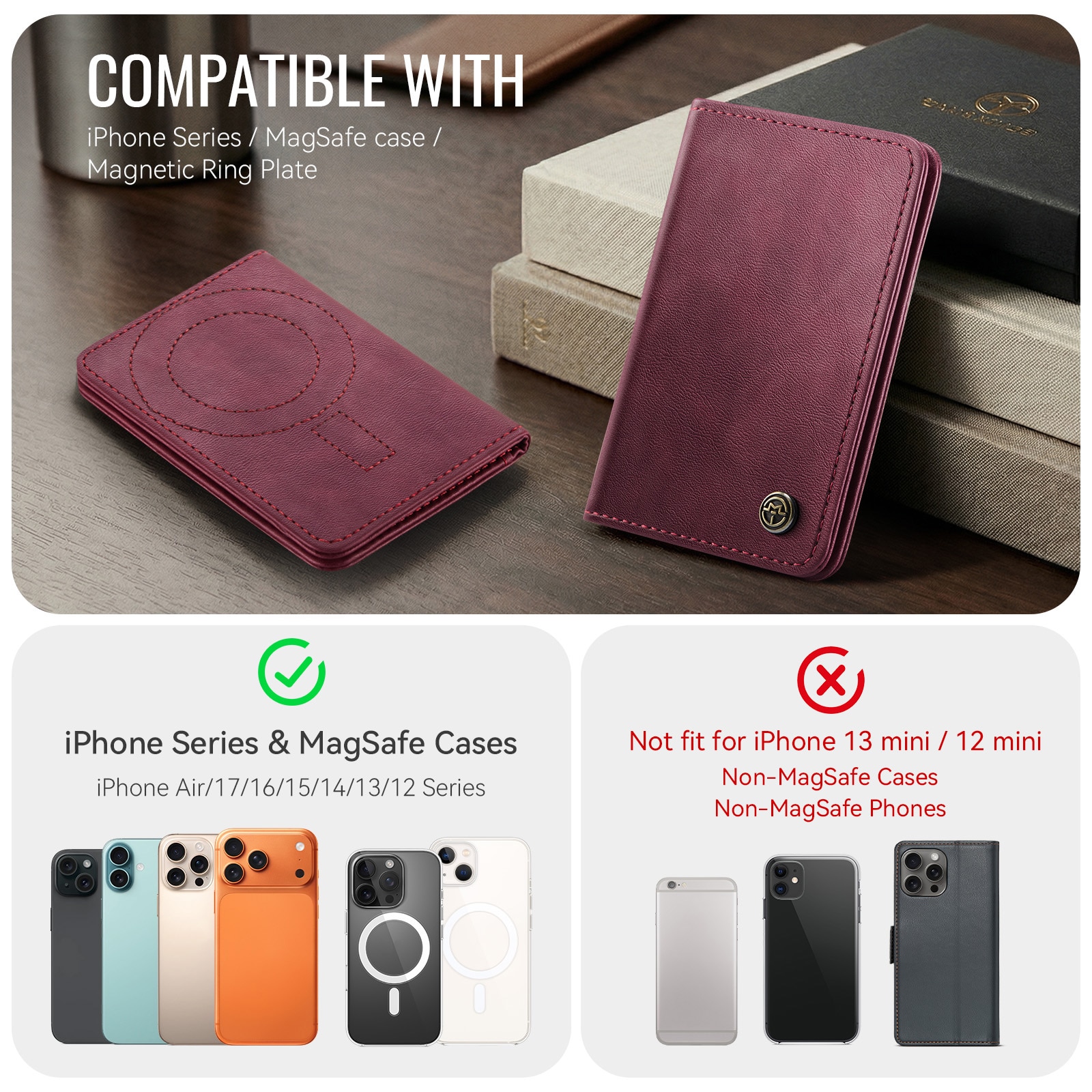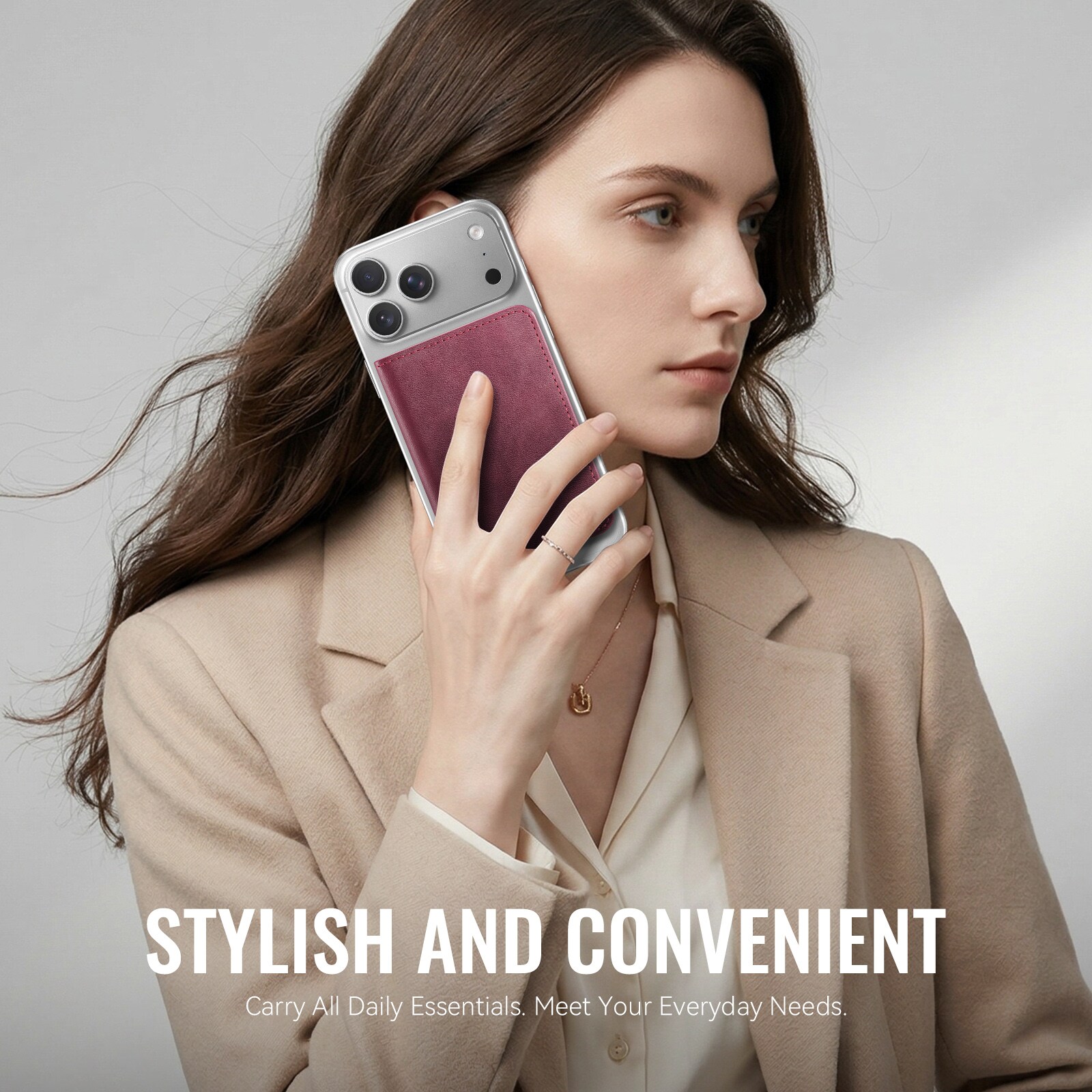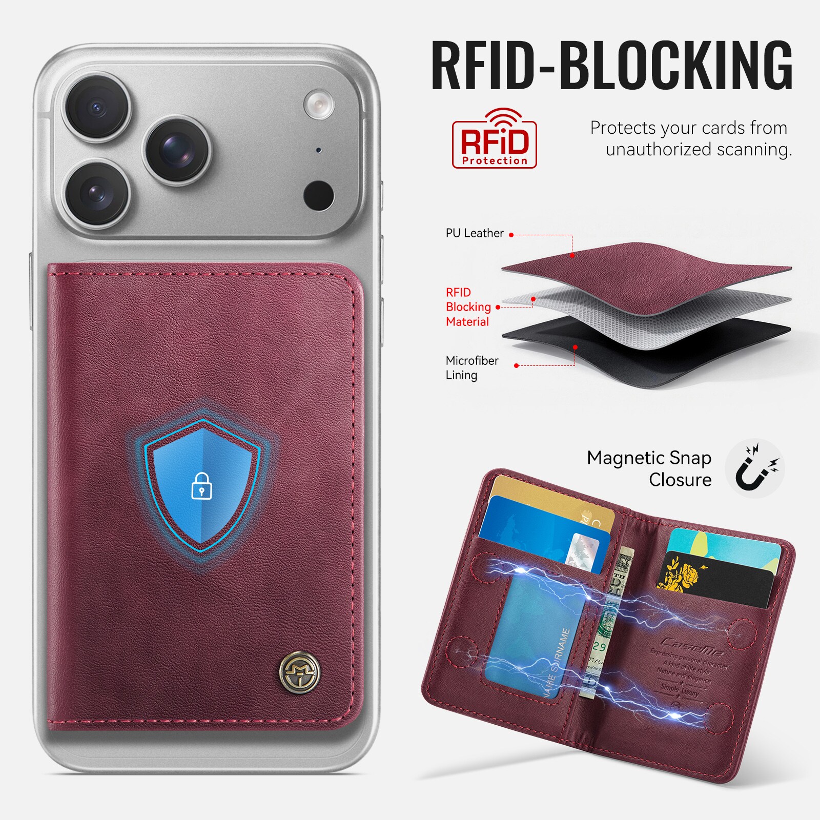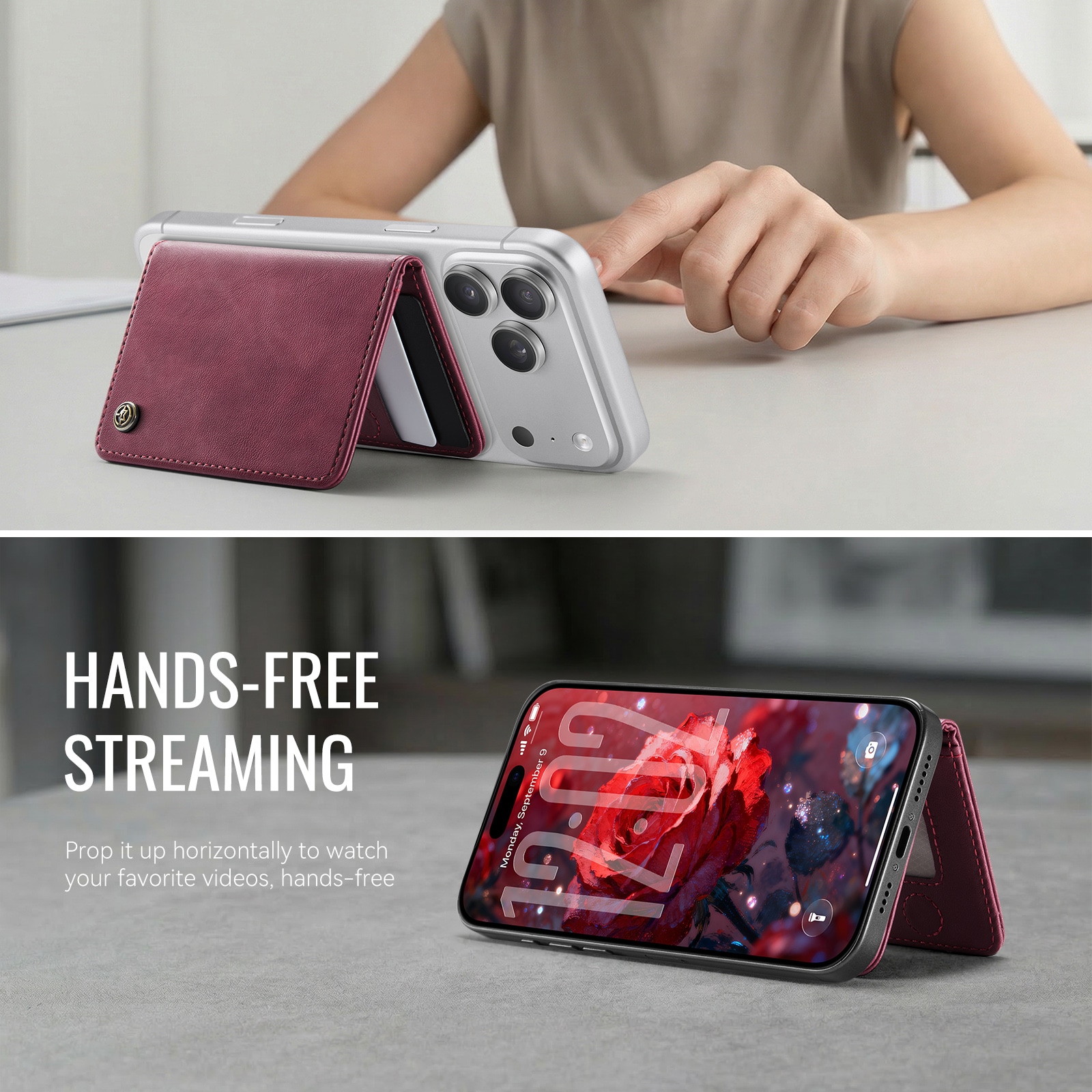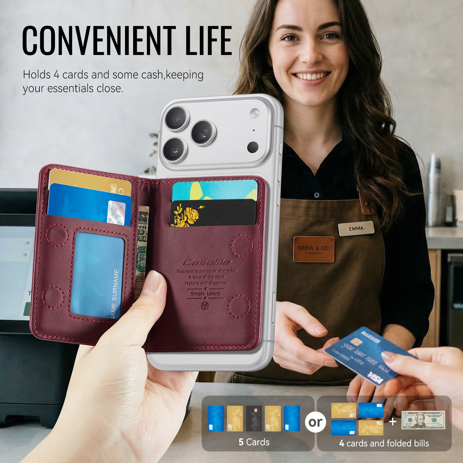 MagSafe leren portemonnee met slank design en praktische standaardfunctie van CaseMe. Deze stijlvolle en compacte kaarthouder biedt ruimte voor maximaal 4 kaarten en contant geld en functioneert tegelijkertijd als een handige telefoonstandaard voor handsfree gebruik. Perfect voor het bekijken van video’s, bellen of surfen zonder je telefoon vast te houden. Met ingebouwde RFID-bescherming blijven je kaarten en persoonlijke gegevens veilig tegen ongeautoriseerd scannen.