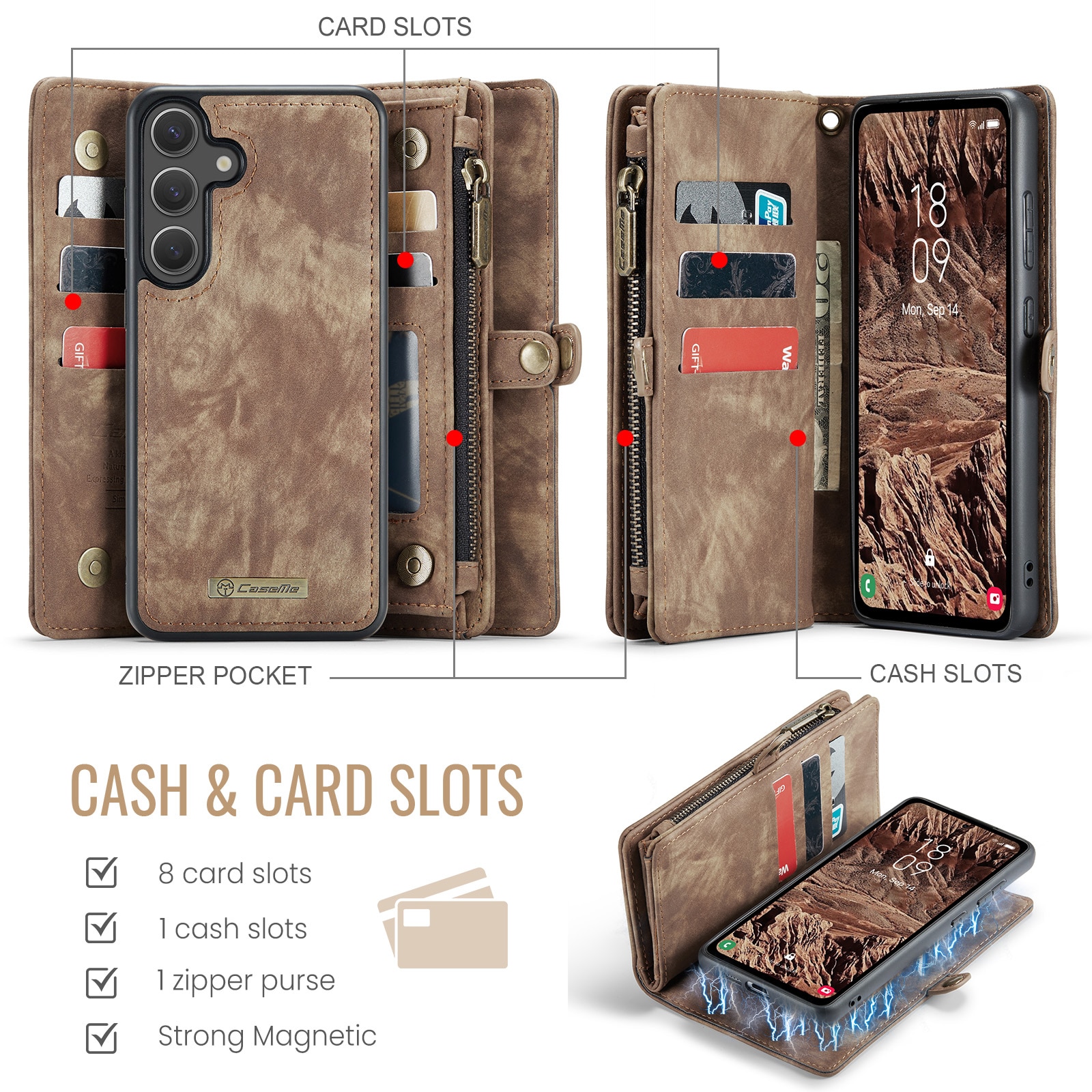 Telefoonhoesje met magnetische case en portemonnee met extra veel kaartsleuven voor Samsung Galaxy S26 Plus van CaseMe. De ruime portemonnee heeft een vak voor bankbiljetten, een muntvak met ritssluiting en meerdere kaartsleuven.