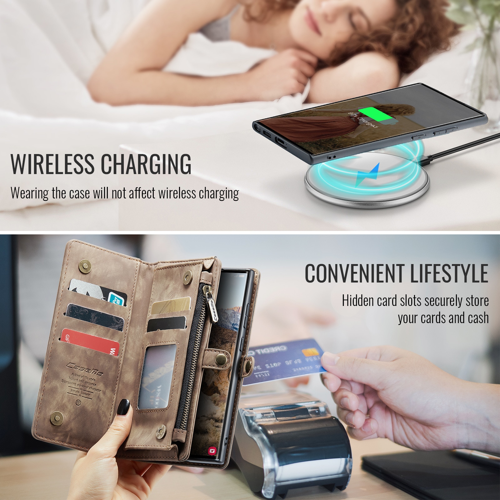 Telefoonhoesje met magnetische case en portemonnee met extra veel kaartsleuven voor Samsung Galaxy S26 Ultra van CaseMe. De ruime portemonnee heeft een vak voor bankbiljetten, een muntvak met ritssluiting en meerdere kaartsleuven.