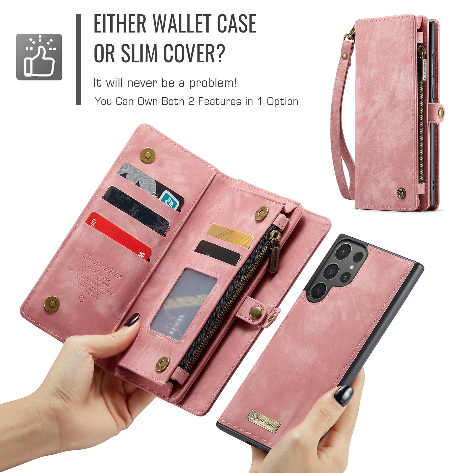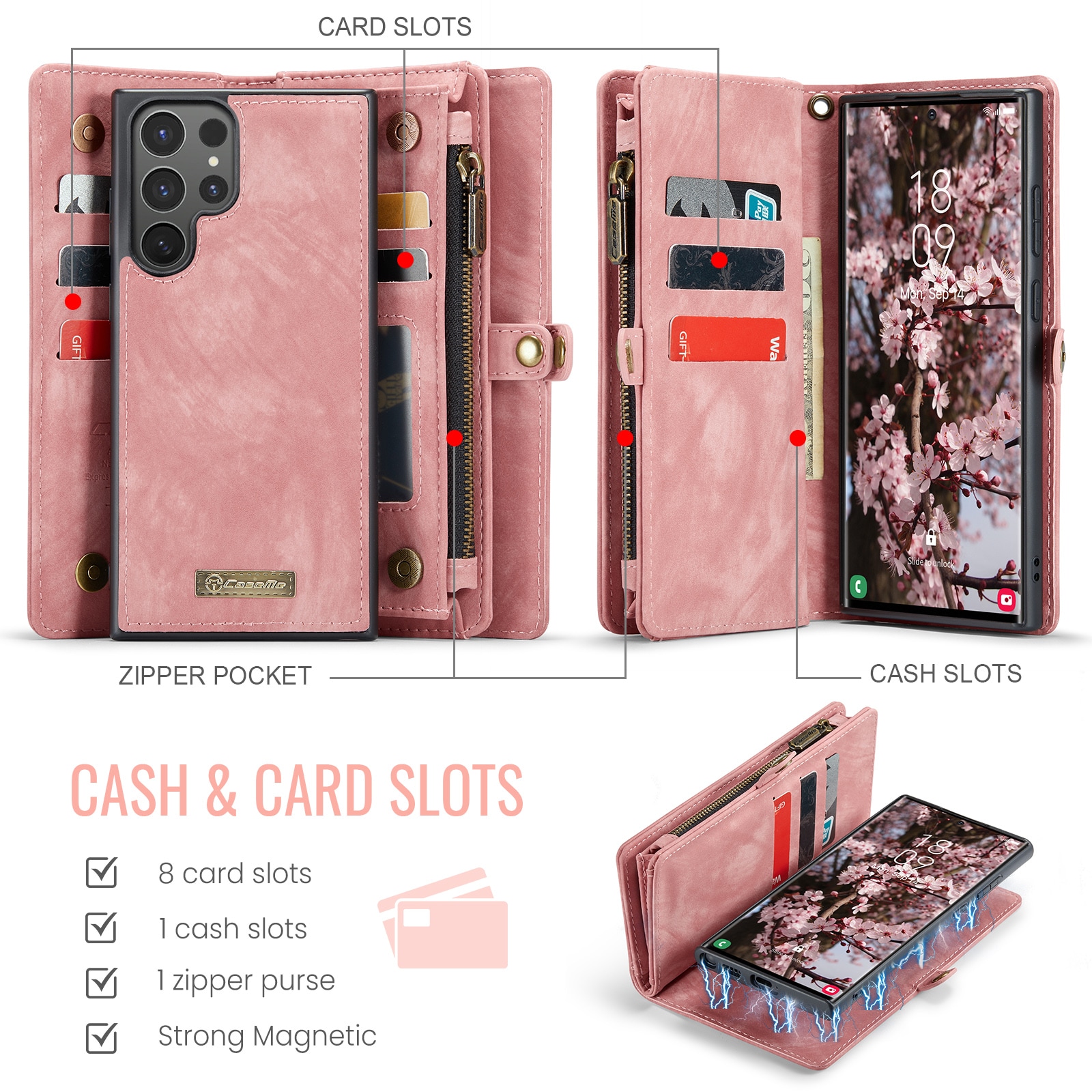 Telefoonhoesje met magnetische case en portemonnee met extra veel kaartsleuven voor Samsung Galaxy S26 Ultra van CaseMe. De ruime portemonnee heeft een vak voor bankbiljetten, een muntvak met ritssluiting en meerdere kaartsleuven.