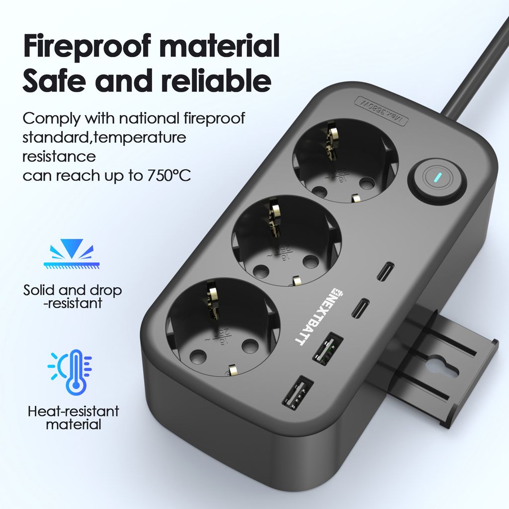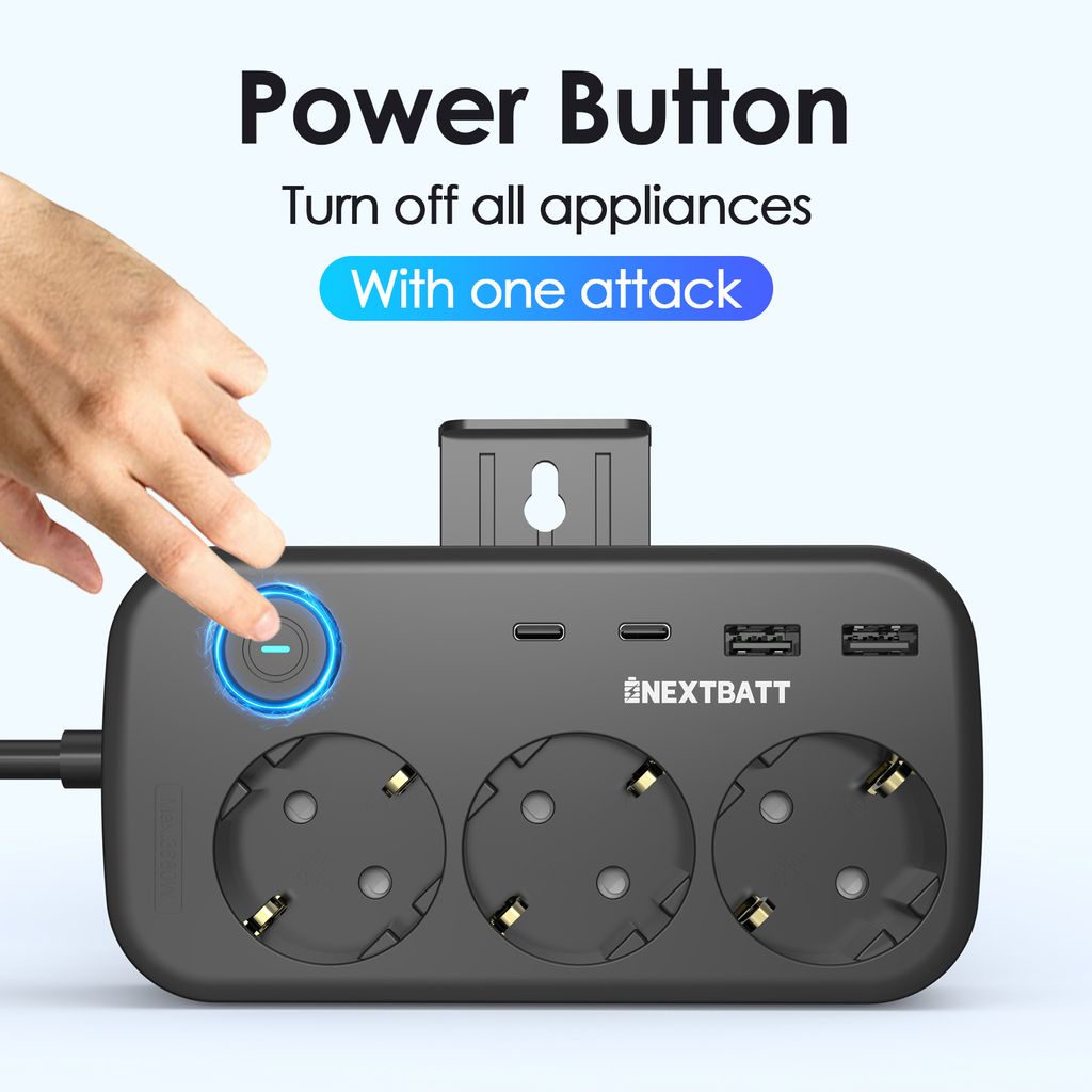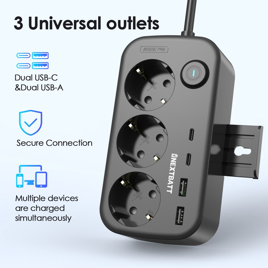 De NEXTBATT stekkerdoos is een praktische en krachtige oplossing om meerdere apparaten tegelijk aan te sluiten en op te laden. Met drie geaarde stopcontacten en twee USB-C- en twee USB-A-poorten kun je eenvoudig smartphone, tablet, laptop, koptelefoon en andere USB-apparaten opladen - perfect voor thuis, kantoor of werkplek.