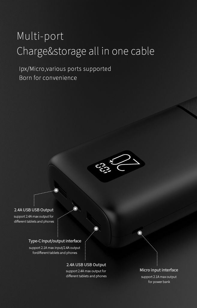 De powerbank beschikt over een USB-C-poort en twee USB-A-poorten, zodat u tot drie apparaten tegelijk kunt opladen. Ondersteunt snelladen en heeft ingebouwde beveiligingsfuncties voor veilig en stabiel opladen. De LED-indicatoren tonen duidelijk het batterijniveau.