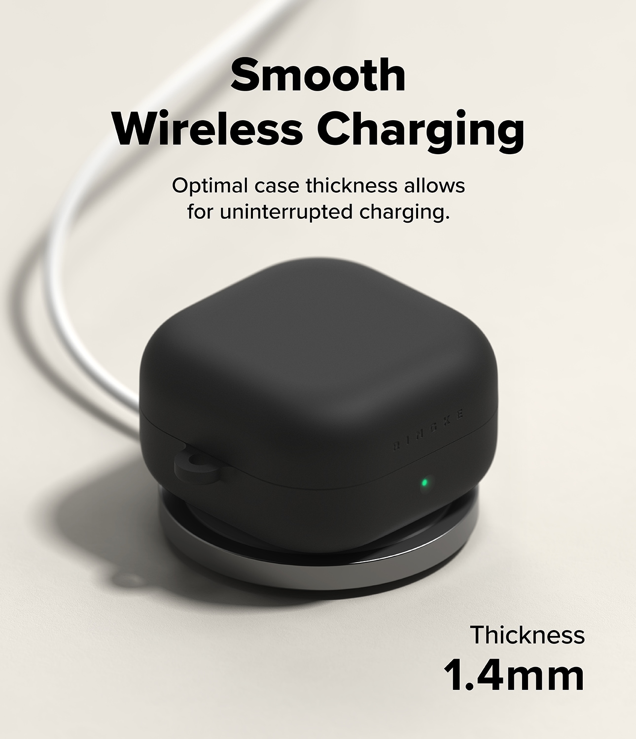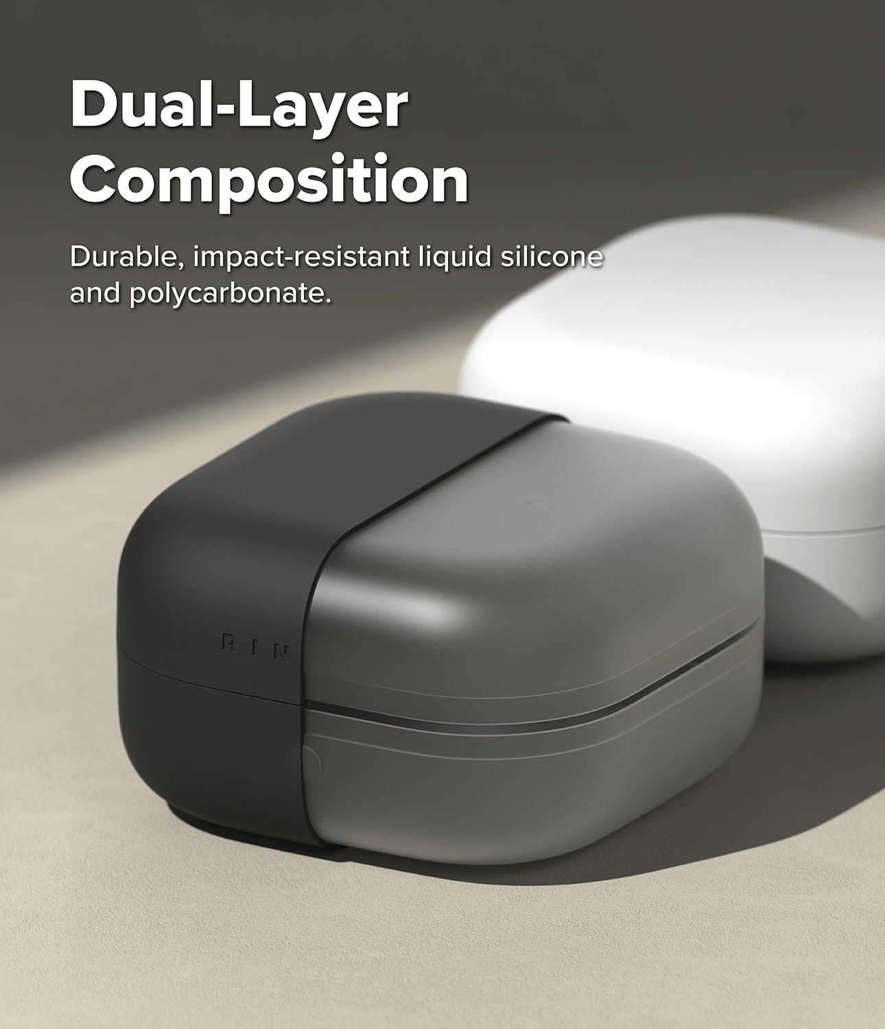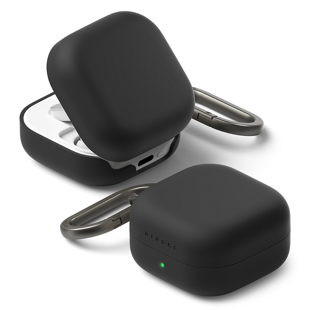Stijlvolle siliconen hoes met karabijnhaak voor Samsung Galaxy Buds 4 Pro van Ringke. De hoes heeft een slank design, maar is toch schokabsorberend om te beschermen tegen beschadigingen. Het is gemaakt van hoogwaardig vloeibaar siliconen met een oppervlak dat zowel luxe aanvoelt als goede bescherming biedt. De hoes heeft een dubbellaagse constructie met een sterk polycarbonaatframe aan de binnenkant en siliconen aan de buitenkant.