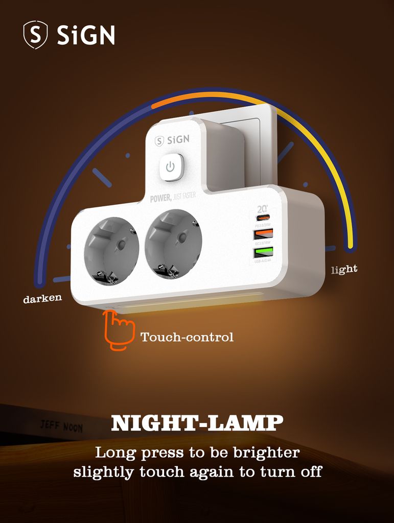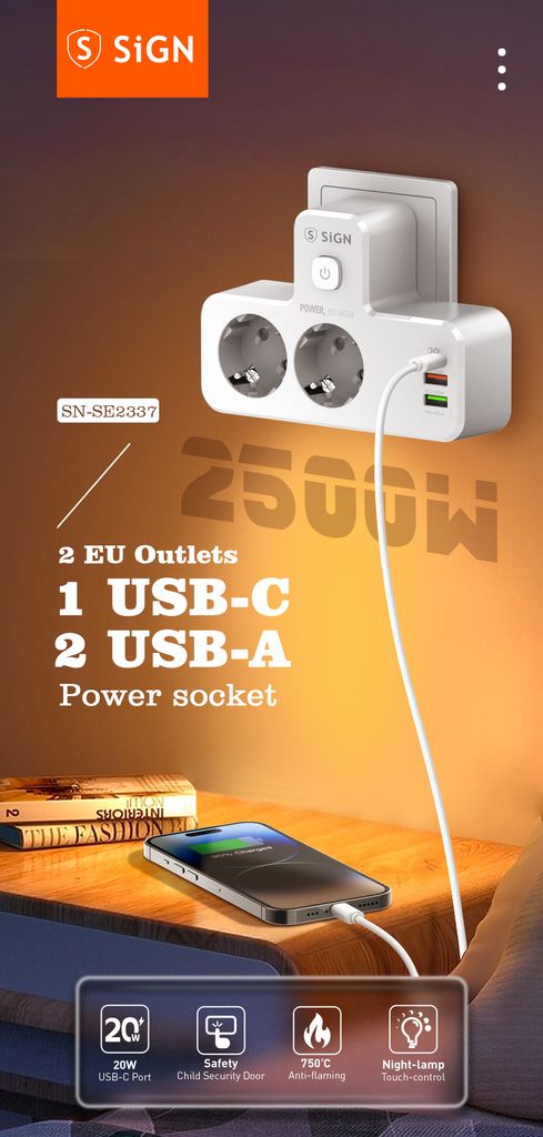 618202-wegs Stekkerdoos met LED-nachtlamp + 1x USB-C + 2x USB-A Withttps://www.phonelife.nl/opladers-en-kabels/accessoires-voor-opladers-kabels/2-wegs-stekkerdoos-met-led-nachtlamp-1x-usb-c-2x-usb-a-wit?channelCountry=NLhttps://www.phonelife.nl/pub_images/original/0_-_-_5_-_-_SE2337_E6_BF_80_E5_85_89_E5_9B_BE_20_286_29_281_29_QMx9by-hIh549xLBT8Lr0.jpgInStock20.95EUR/opladers-en-kabels/accessoires-voor-opladers-kabelsSiGN<p>SiGN 20W stekkerdoos met LED-nachtlamp is een slimme en ruimtebesparende oplossing voor stroom en opladen thuis en op kantoor. Met twee AC-stopcontacten, twee USB-A-poorten en één USB-C-poort kunt u meerdere apparaten tegelijk aansluiten en opladen. Ideaal voor smartphones, tablets en andere USB-apparaten. De ingebouwde LED-nachtlamp geeft een zacht en aangenaam licht, perfect voor slaapkamer, hal of naast het bed. Met ondersteuning voor Power Delivery en Quick Charge levert de USB-C-poort tot 20W snelladen. De stekkerdoos combineert hoge functionaliteit met een compact ontwerp voor dagelijks gebruik.</p>
