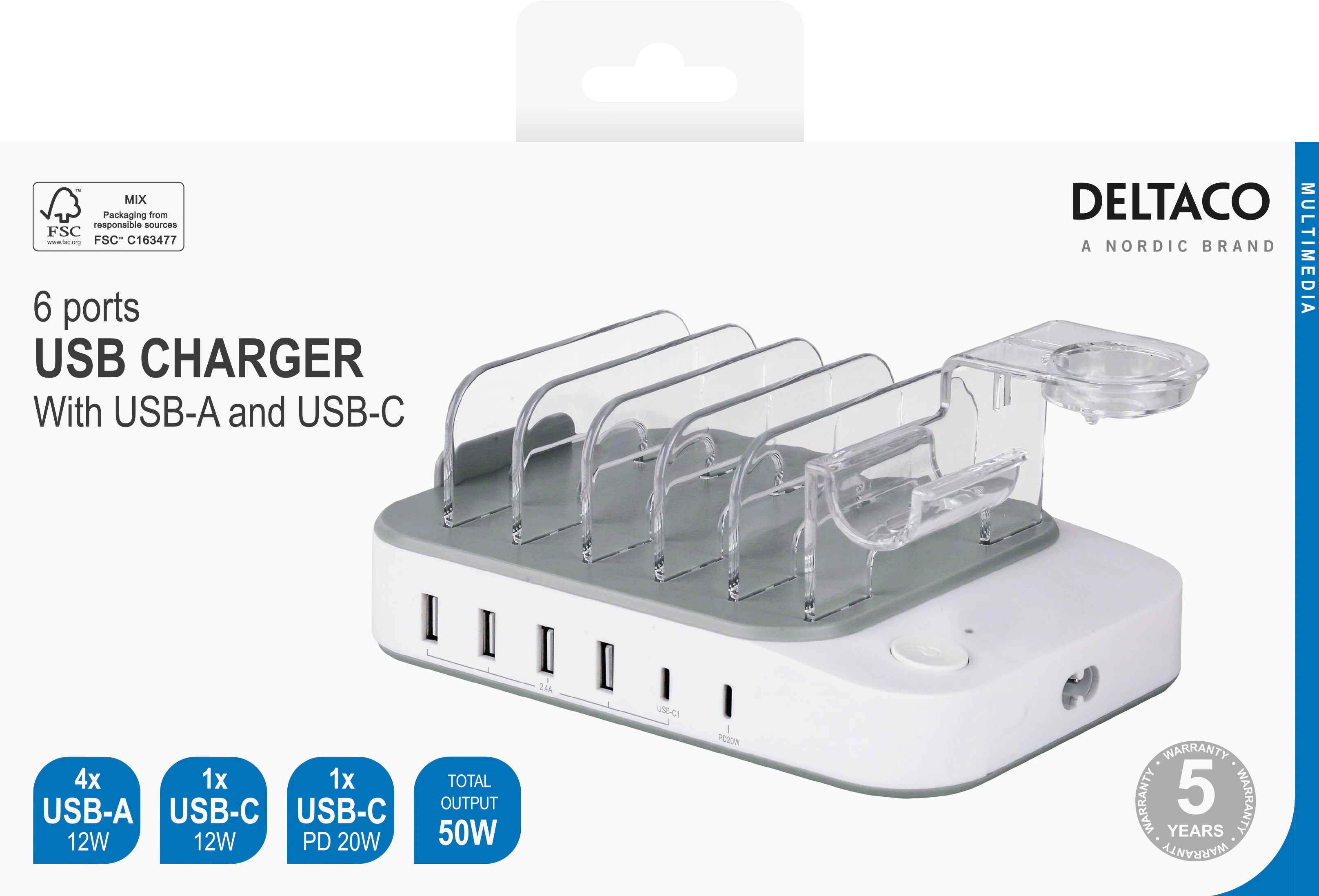 61080Laadstation voor 6 apparaten 4 x USB-A, 2 x USB-C 50 W Withttps://www.phonelife.nl/opladers-en-kabels/accessoires-voor-opladers-kabels/laadstation-voor-6-apparaten-4-x-usb-a-2-x-usb-c-50-w-wit?channelCountry=NLhttps://www.phonelife.nl/pub_images/original/DPS-0203-1.pngInStock59.95EUR/opladers-en-kabels/accessoires-voor-opladers-kabelsDeltaco<p>Met dit USB-laadstation kun je tot zes apparaten tegelijk eenvoudig en overzichtelijk opladen. Het laadstation is uitgerust met vier USB-A-poorten en twee USB-C-poorten en is ideaal voor smartphones, tablets, draadloze oordopjes, smartwatches en andere USB-apparaten. Een maximale totale uitgangsvermogen van tot 50 W zorgt voor stabiel en efficiënt opladen van al je apparaten.</p>