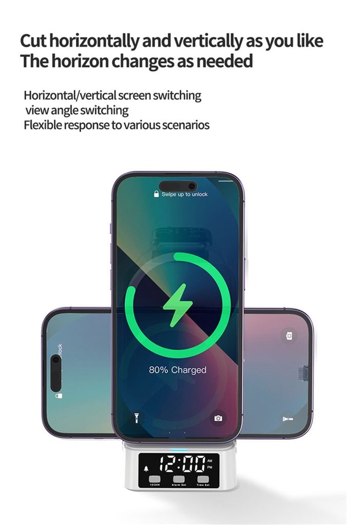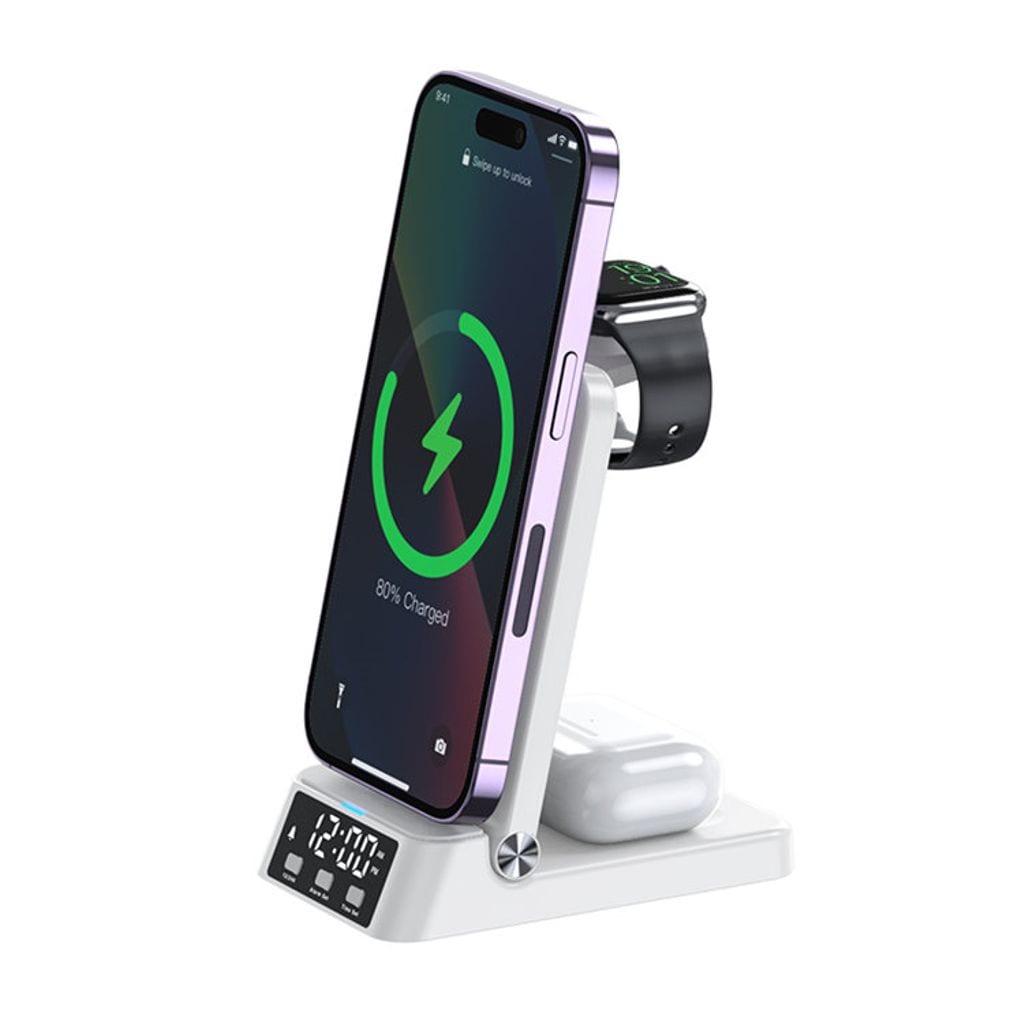 Het SiGN 3-in-1 draadloze laadstation met wekker 15W is een praktische en ruimtebesparende oplossing om uw smartphone, Apple Watch en draadloze oordopjes tegelijkertijd op te laden. De geïntegreerde digitale klok met alarmfunctie maakt het ideaal voor uw nachtkastje of bureau.