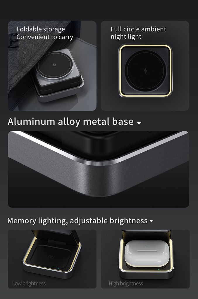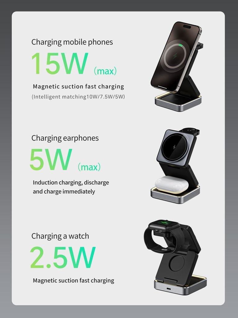 Het magnetische laadoppervlak zorgt voor stabiele plaatsing en maakt het mogelijk om de telefoon zowel verticaal als horizontaal te gebruiken tijdens het opladen. Het laadstation ondersteunt draadloos snelladen tot 15W voor smartphones en heeft aparte laadzones... Meer