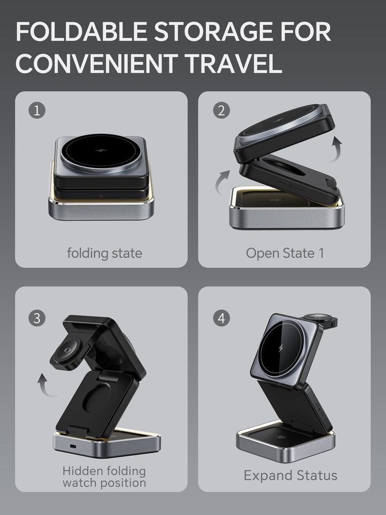 Het opvouwbare 3-in-1 draadloze magnetische laadstation 15W van SiGN is een praktische en compacte oplossing om uw smartphone, Apple Watch en draadloze oordopjes tegelijkertijd op te laden. Het opvouwbare ontwerp maakt het laadstation ideaal voor reizen en gebruik thuis of op kantoor, terwijl het ruimte bespaart op uw bureau.