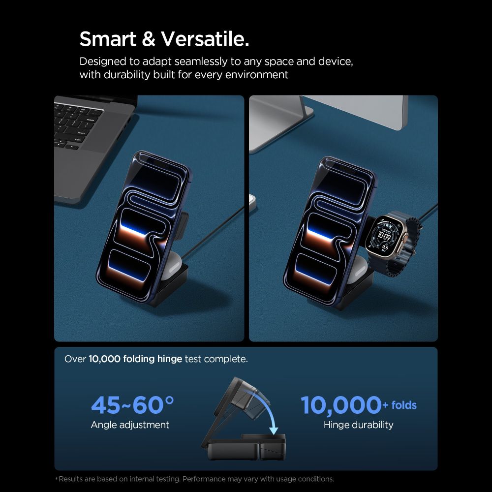 Laad tot drie apparaten tegelijk op met het Spigen Essential Qi2.2 3-in-1 draadloze laadstation. Met ondersteuning voor Qi2.2 en tot 25W vermogen laad je smartphone, smartwatch en draadloze oordopjes snel en zonder kabels op. De sterke magneten zorgen voor stabiele positionering van MagSafe-compatibele apparaten.