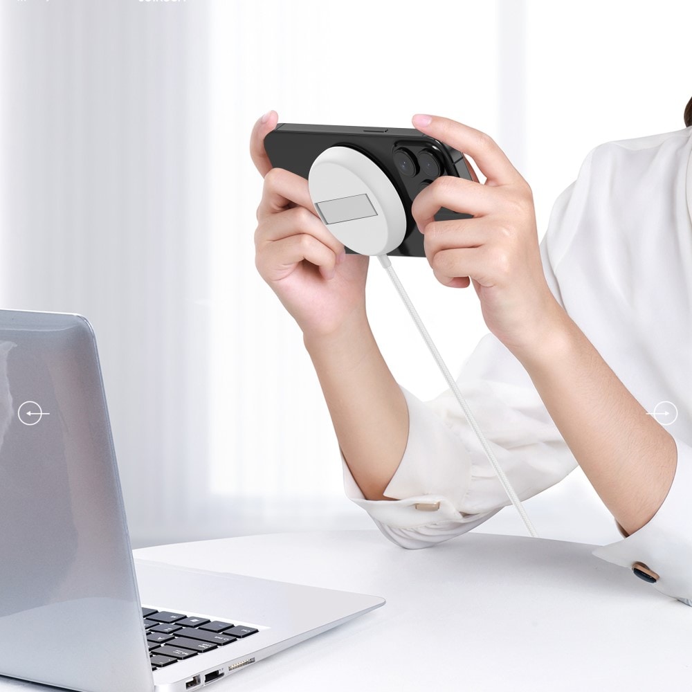 Laad je telefoon snel en efficiënt op met deze draadloze oplader. Met zijn slanke ontwerp past hij perfect in elke omgeving. De oplader levert tot 15W vermogen voor snelle en betrouwbare oplading. Het magnetische ontwerp, compatibel met MagSafe, zorgt ervoor dat je apparaat stevig op zijn plek blijft zitten. Bovendien is hij uitgerust met een inklapbare standaard, zodat je je telefoon gemakkelijk kunt plaatsen voor handsfree kijken tijdens het opladen.