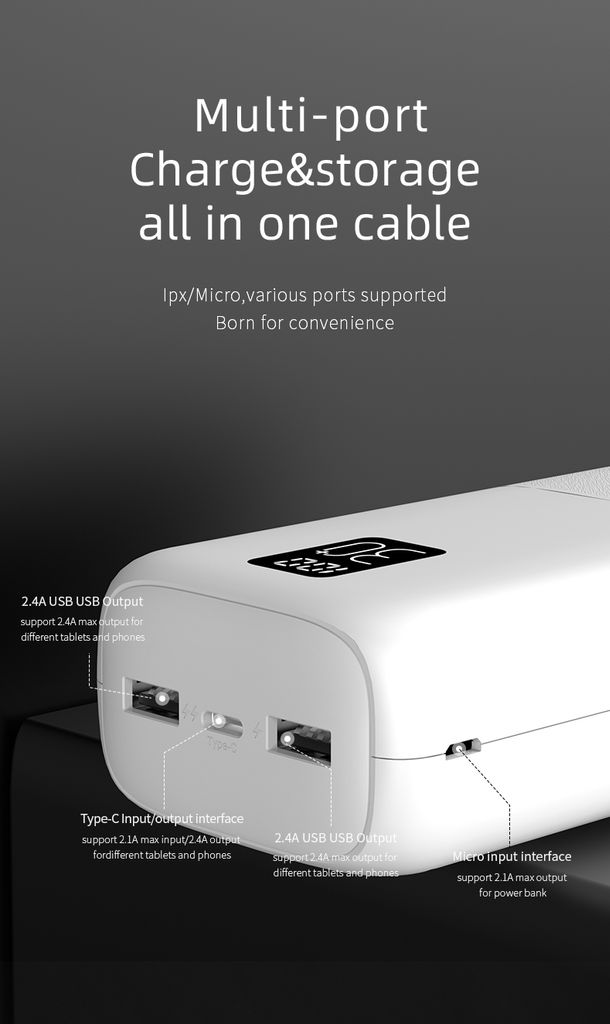 <p>De powerbank is uitgerust met één USB-C-poort en twee USB-A-poorten, waardoor je meerdere apparaten tegelijk kunt opladen. De USB-A-poorten ondersteunen tot 2.4A voor snel en efficiënt opladen van je smartphone of tablet. De powerbank kan ook worden opgeladen via USB-C of Micro-USB, wat zorgt voor flexibel en eenvoudig gebruik.</p>