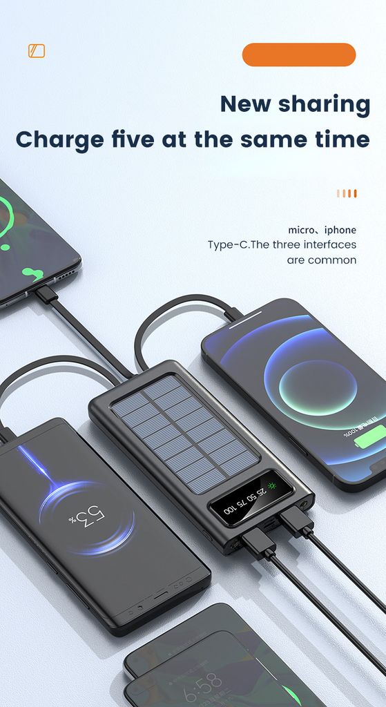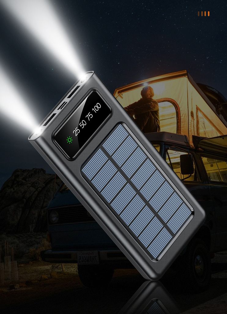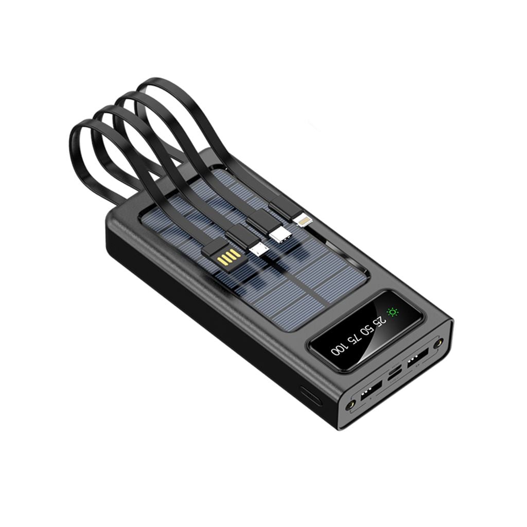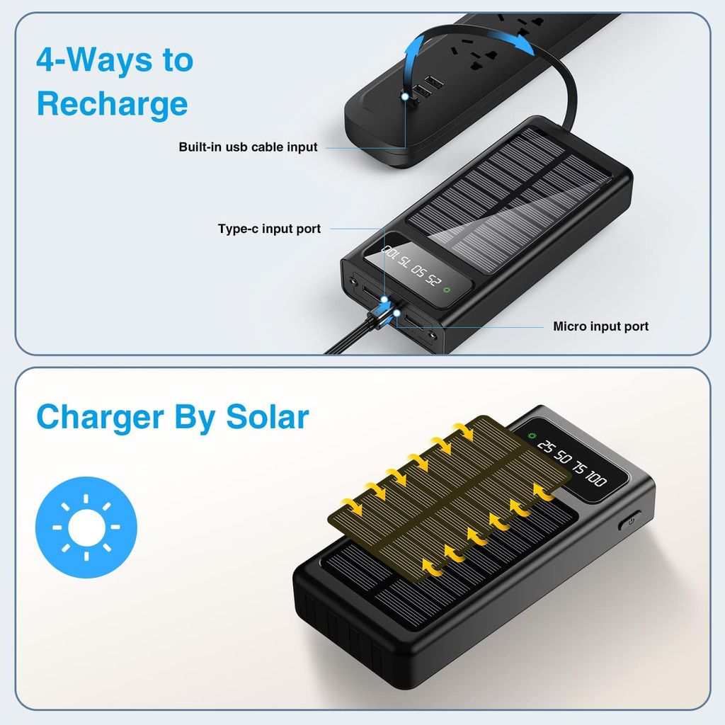 <p>De powerbank kan worden opgeladen via USB-C, Micro-USB of geïntegreerde zonnepanelen, wat flexibel gebruik mogelijk maakt zonder stopcontact. De ingebouwde kabels - USB-C, Lightning, Micro-USB en USB-A - maken het mogelijk om meerdere apparaten op te laden zonder extra kabels. De USB-A-poort zorgt voor stabiel en veilig opladen en het LED-display toont duidelijk het batterijniveau. De ingebouwde LED-zaklamp maakt hem extra handig voor kamperen en wandelen.</p>