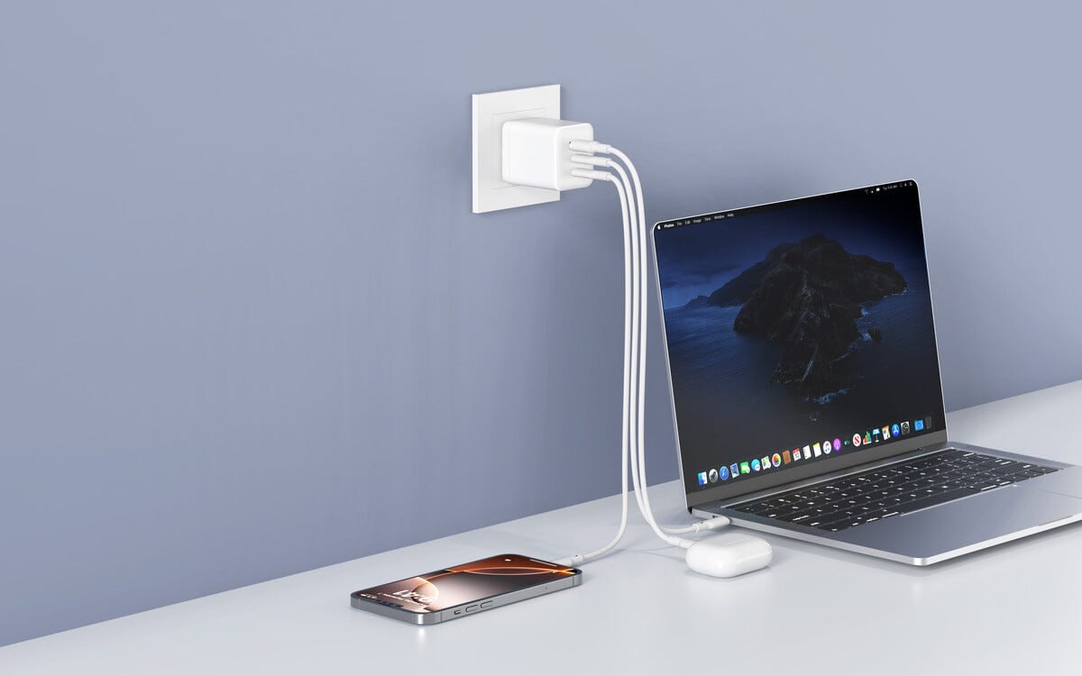 <p>De lader is uitgerust met twee USB-C-poorten en één USB-A-poort waardoor tot drie apparaten tegelijk kunnen worden opgeladen. De USB-A-poort ondersteunt Quick Charge tot 22,5 W en de lader verdeelt automatisch het vermogen afhankelijk van het aantal aangesloten apparaten. Het praktische ontwerp maakt het eenvoudig om de lader mee te nemen als complete laadoplossing.</p>