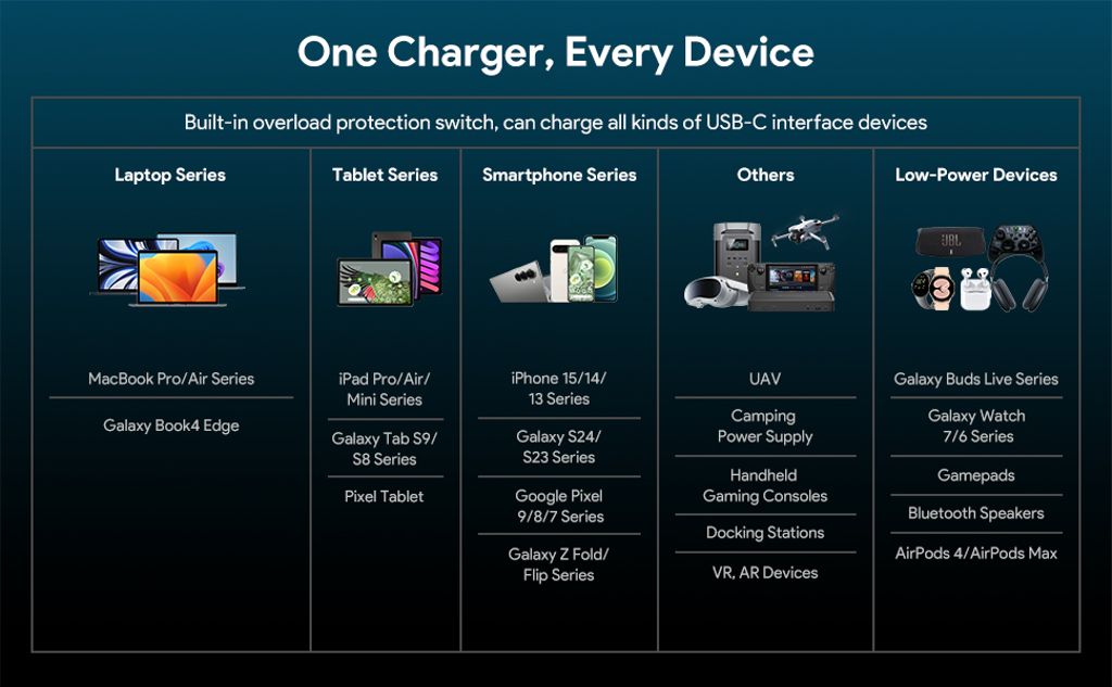 De universele compatibiliteit maakt de lader geschikt voor MacBook, laptops, tablets en smartphones met USB-C. De 2 meter lange kabel zorgt voor flexibel gebruik thuis, op kantoor of onderweg. Het compacte ontwerp en ingebouwde beveiliging zorgen voor veilige oplading.