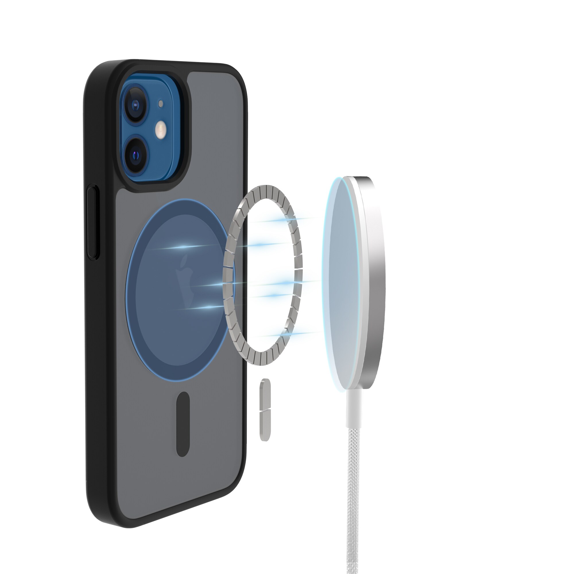 Hybride hoes met magnetische ring voor Apple iPhone 12 Mini van Mobique. De hoes heeft een stijlvolle, matte afwerking en is voorzien van een magnetische ring aan de achterkant. Deze ring maakt het gemakkelijk om de hoes te gebruiken met MagSafe-accessoires zoals opladers en kaarthouders.