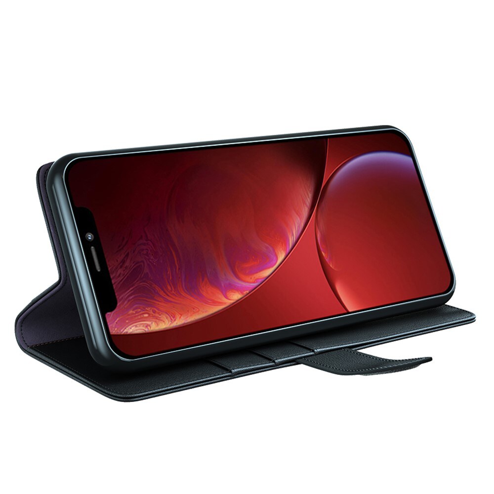 Bookcover hoesje van echt leer voor de Apple iPhone 13 Pro Max Het hoesje beschermt je hele telefoon en heeft plek voor pasjes aan de binnenkant van de voorflap. De pasjeshouder heeft drie vakken en een groter vakje voor briefgeld of bonnetjes.