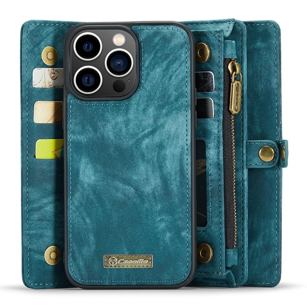 Telefoonhoesje met magnetische case en portemonnee met extra veel kaartsleuven voor Apple iPhone 13 Pro van CaseMe. De ruime portemonnee heeft een vak voor bankbiljetten, een muntvak met ritssluiting en meerdere kaartsleuven.