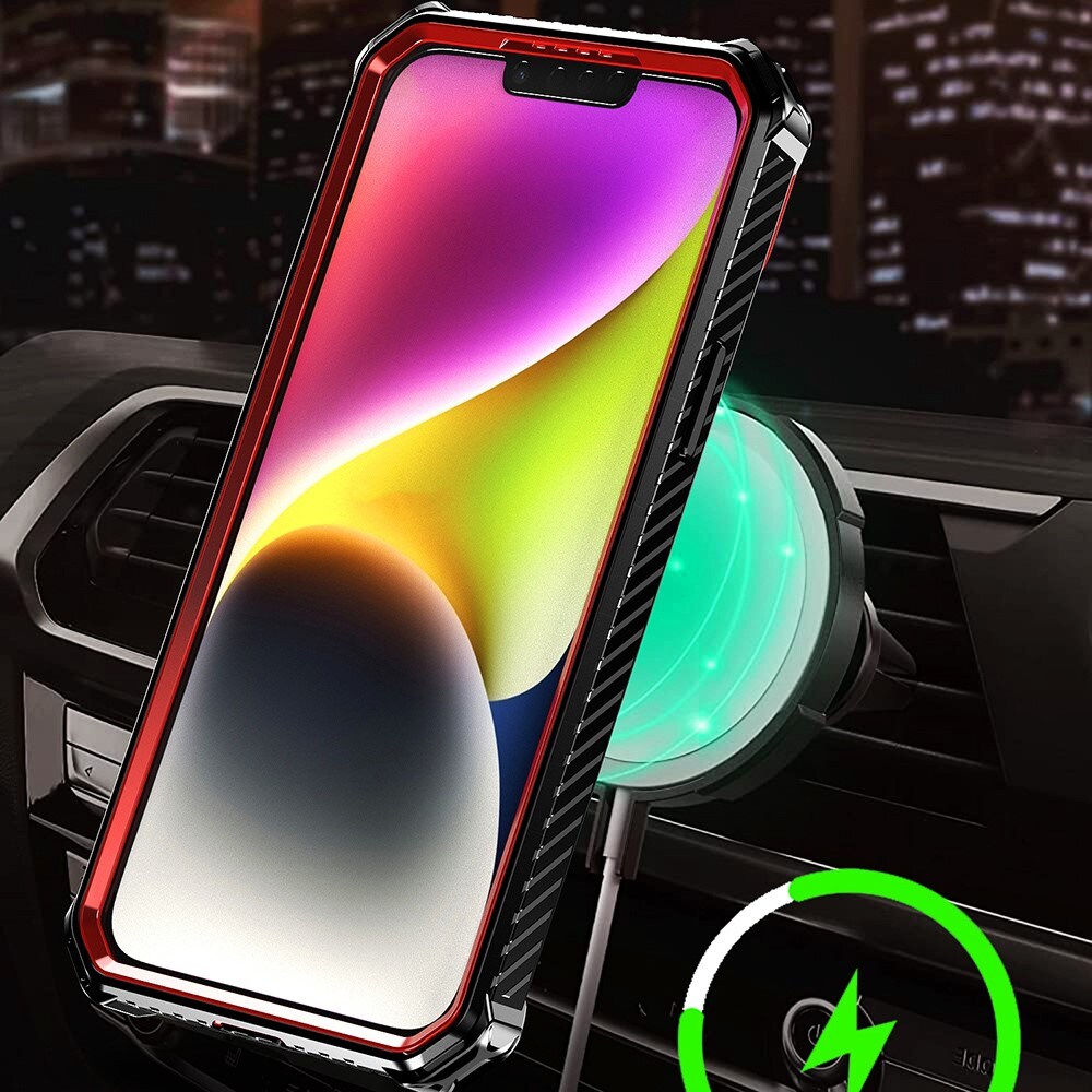 Backcase hoesje met uitklapbare magnetische ring voor iPhone 14. Dit hoesje bestaat uit verschillende materialen zodat het de beste bescherming tegen schokken en vallen biedt - een kern van TPU-siliconen en daaromheen versteviging in kunststof. De ring aan de achterkant is magnetisch en kan worden gebruikt in combinatie met MagSafe-compatibele accessoires zoals opladers en kaarthouders. De ring kan ook als standaard gebruikt worden om je telefoon horizontaal neer te zetten voor het bekijken van films, clips of om te gamen.