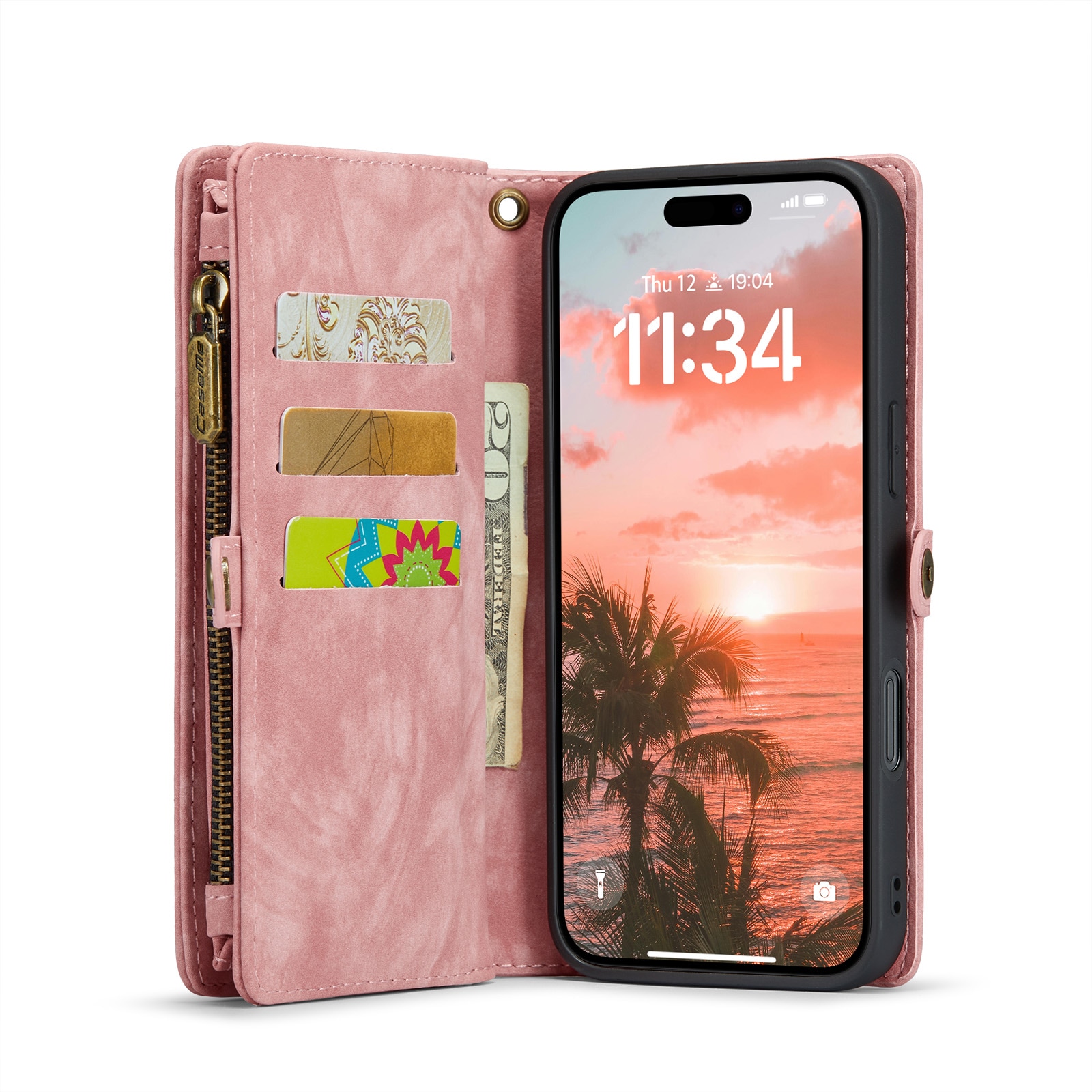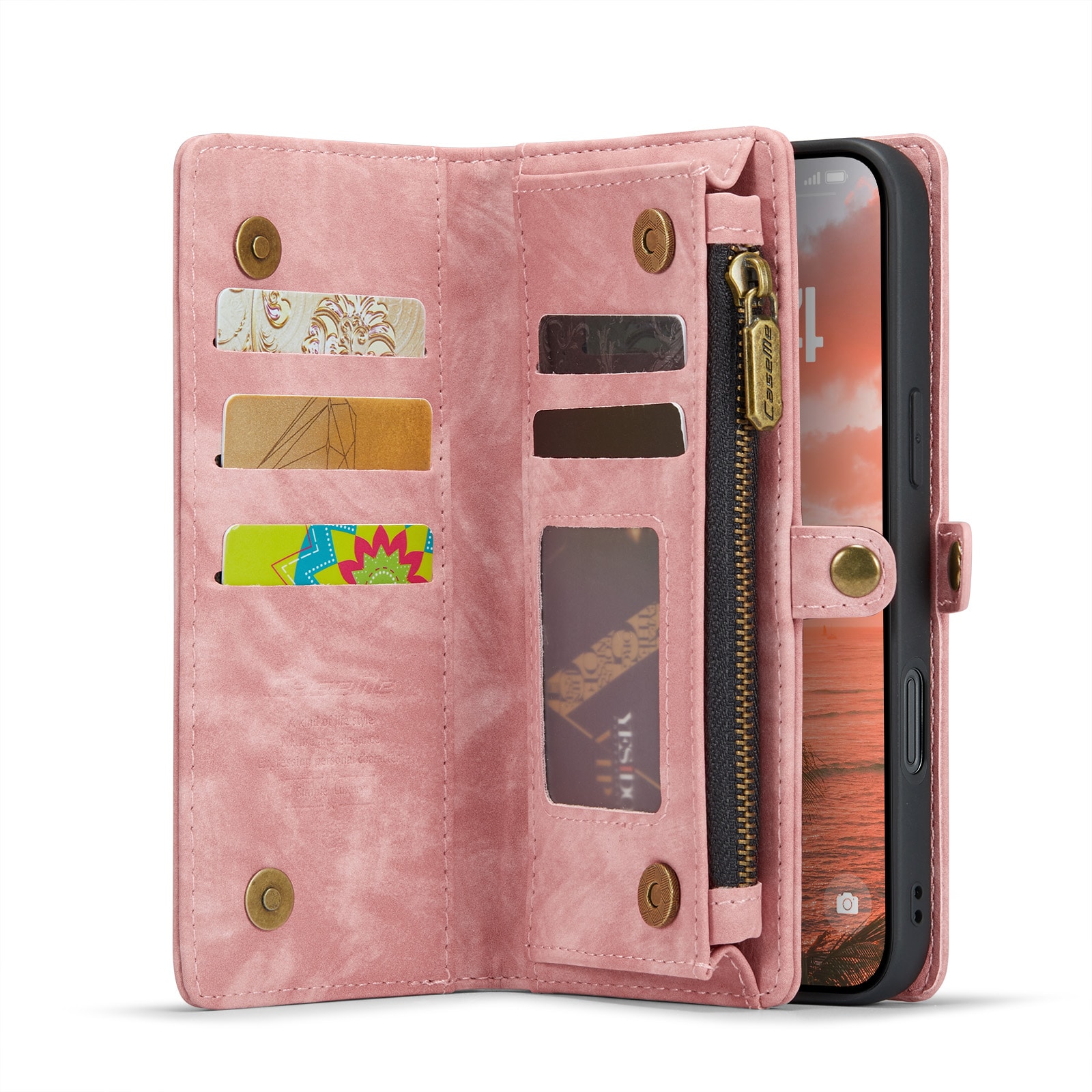 Telefoonhoesje met magnetische case en portemonnee met extra veel kaartsleuven voor Apple iPhone 16 Pro Max van CaseMe. De ruime portemonnee heeft een vak voor bankbiljetten, een muntvak met ritssluiting en meerdere kaartsleuven.