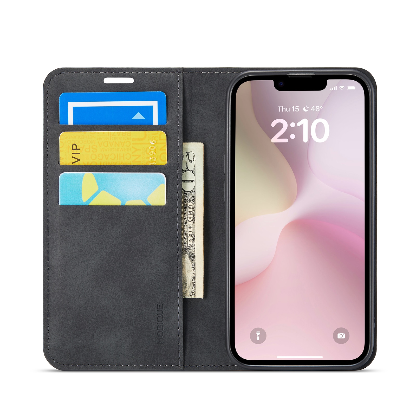 Aan de binnenkant van de flap bevinden zich kaartsleuven met ruimte voor maximaal twee kaarten. Daarnaast is er een vakje voor bonnetjes en briefgeld. Het hoesje blijft gesloten met discrete magneten die in de flap zijn verwerkt.