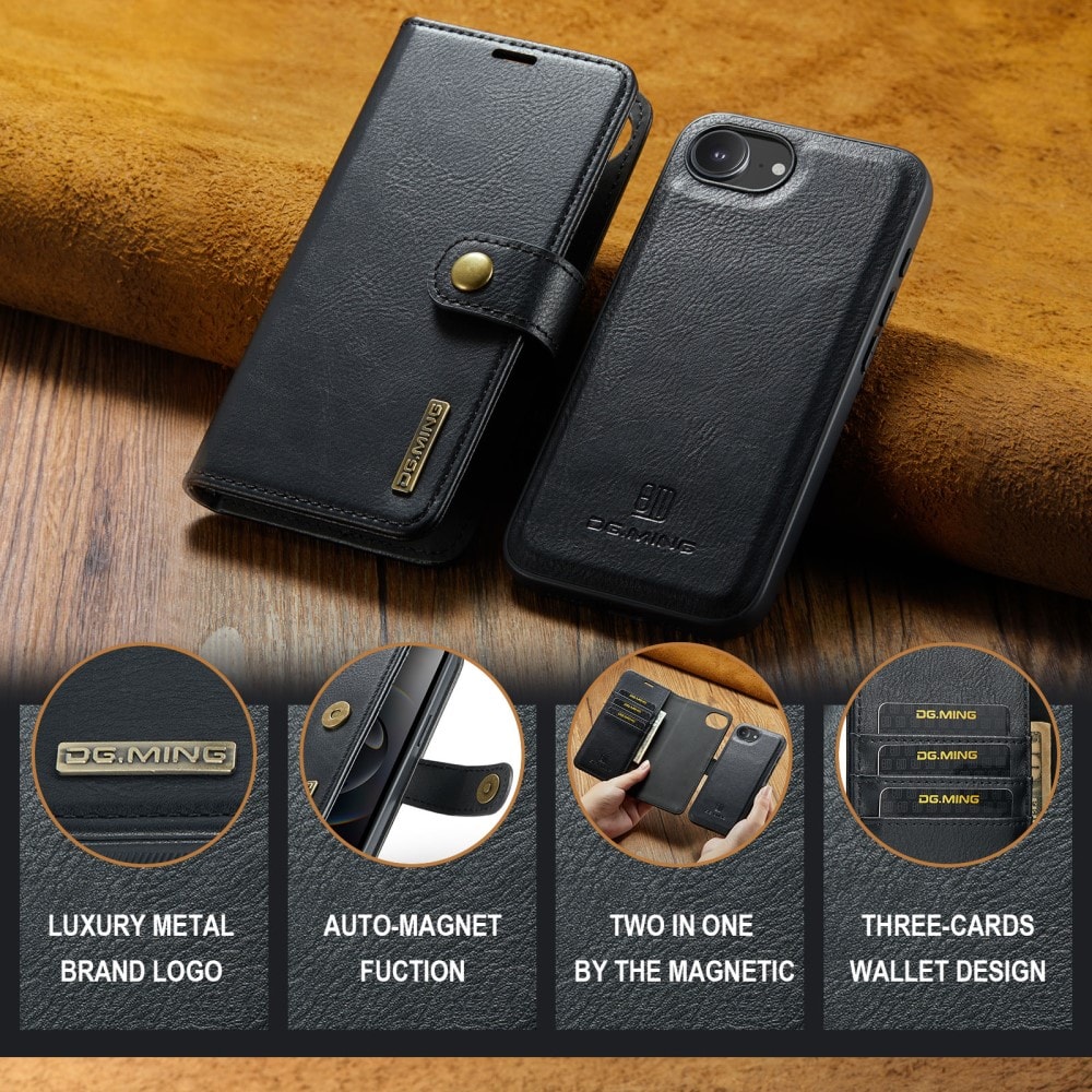 2-in-1-hoesje bestaande uit een bookcoverhoesje met daarin een afneembare magneet-backcase voor Apple iPhone 16e van DG.MING. Het hoesje heeft een klassieke en stijlvolle uitstraling. Eenvoudig losnemen van je telefoon in het backcover hoesje om enkel je mobiel te gebruiken, bijvoorbeeld thuis of op werk.
