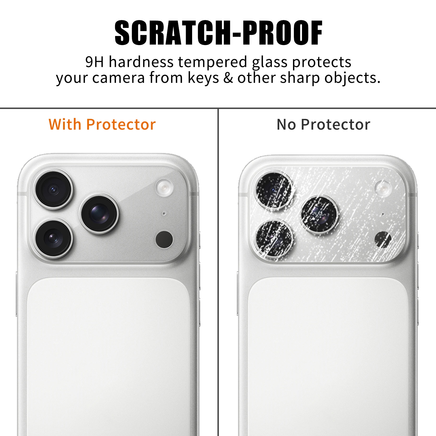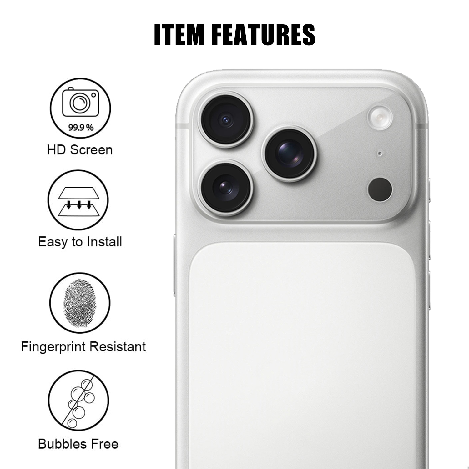 Cameralensbeschermer van gehard glas voor Apple iPhone 17 Pro, ontworpen om de cameramodule te beschermen tegen krassen, stoten en externe slijtage. De beschermer is volledig dekkend en bedekt zowel de lenzen als de camerabehuizing. Na montage is de beschermer discreet en heeft hij geen invloed op het uiterlijk van de telefoon.