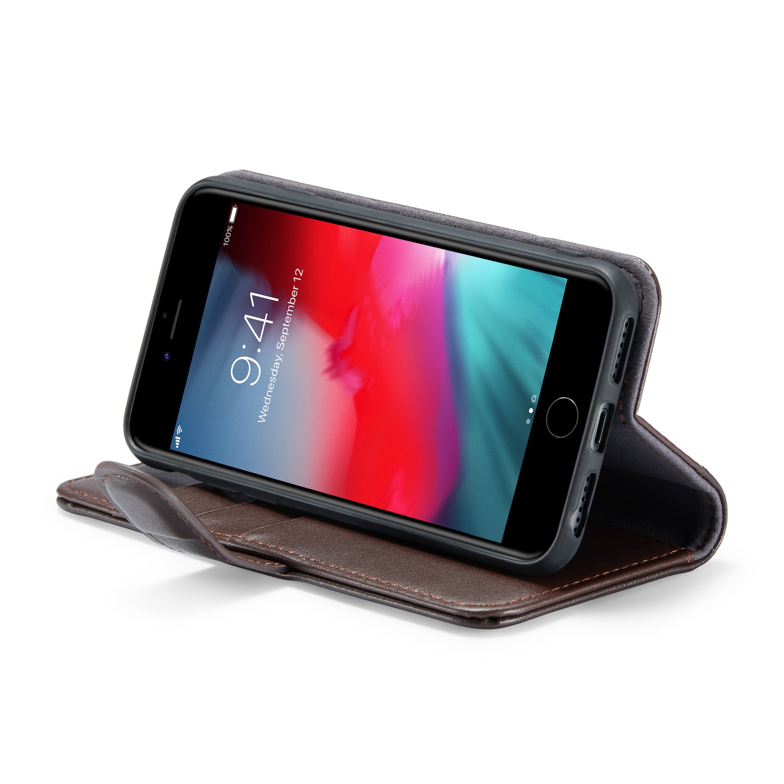 Bookcover hoesje voor Apple iPhone SE 2020. Het hoesje beschermt je hele telefoon en heeft plek voor pasjes aan de binnenkant van de voorflap. De pasjeshouder heeft drie vakken en een groter vakje voor briefgeld of bonnetjes.