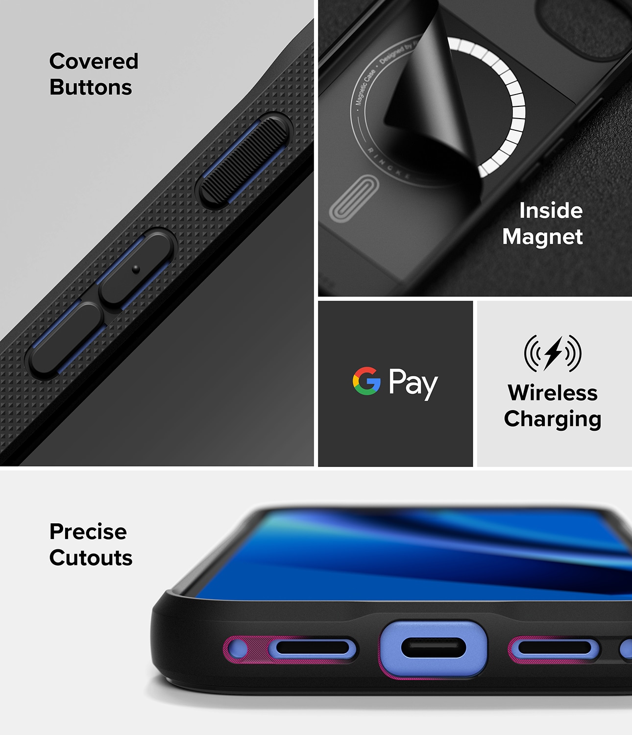 Onyx backcoverhoesje met MagSafe van Ringke voor Google Pixel 10a. Deze case is stootdempend om schade aan je telefoon te voorkomen en door de ondersteuning voor MagSafe kun je eenvoudig je MagSafe-accessoires en MagSafe-oplader gebruiken met dit hoesje om je telefoon.