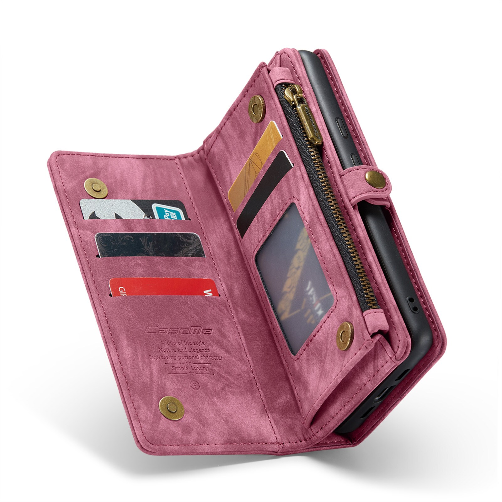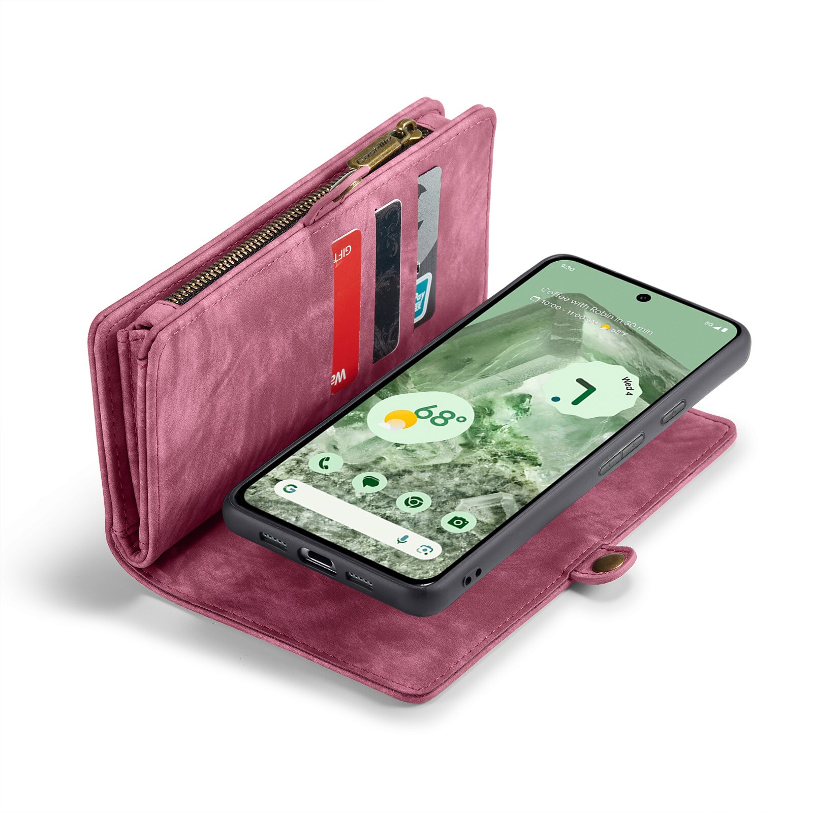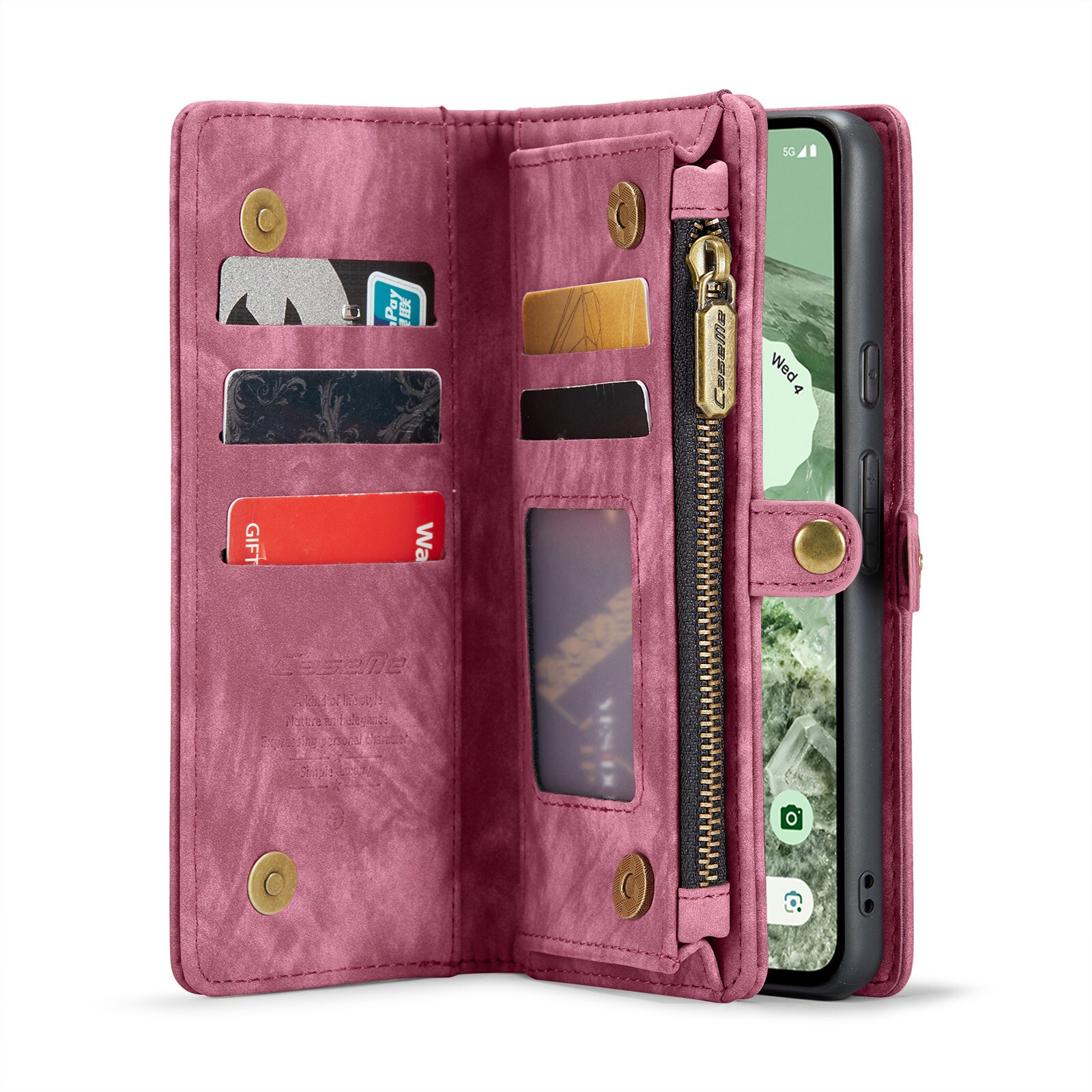 Telefoonhoesje met magnetische case en portemonnee met extra veel kaartsleuven voor Google Pixel 8a van CaseMe. De ruime portemonnee heeft een vak voor bankbiljetten, een muntvak met ritssluiting en meerdere kaartsleuven.