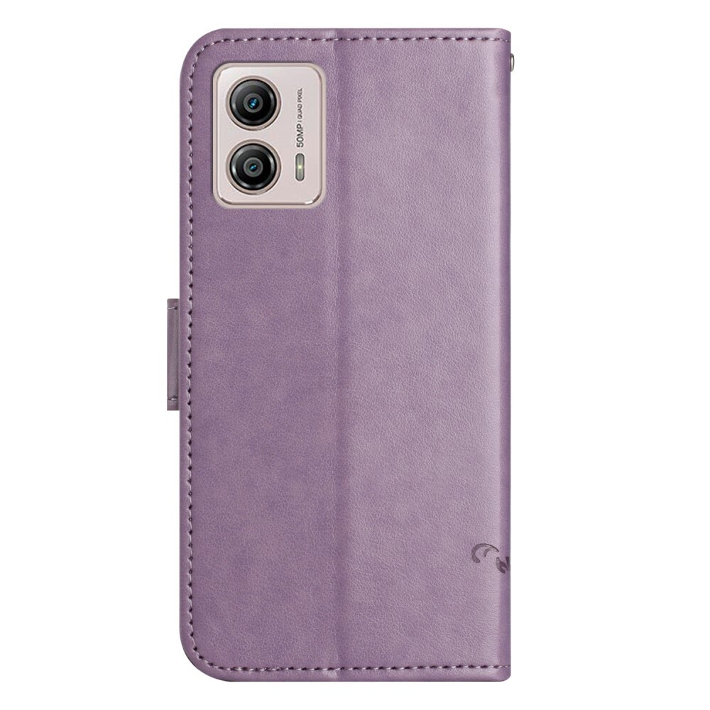 Bookcover hoesje met een vlinderdessin in het leer gestanst voor Motorola Moto G53. Het hoesje is zowel mooi als functioneel en beschermt je hele telefoon tegen krassen, beschadigingen en viezigheid.