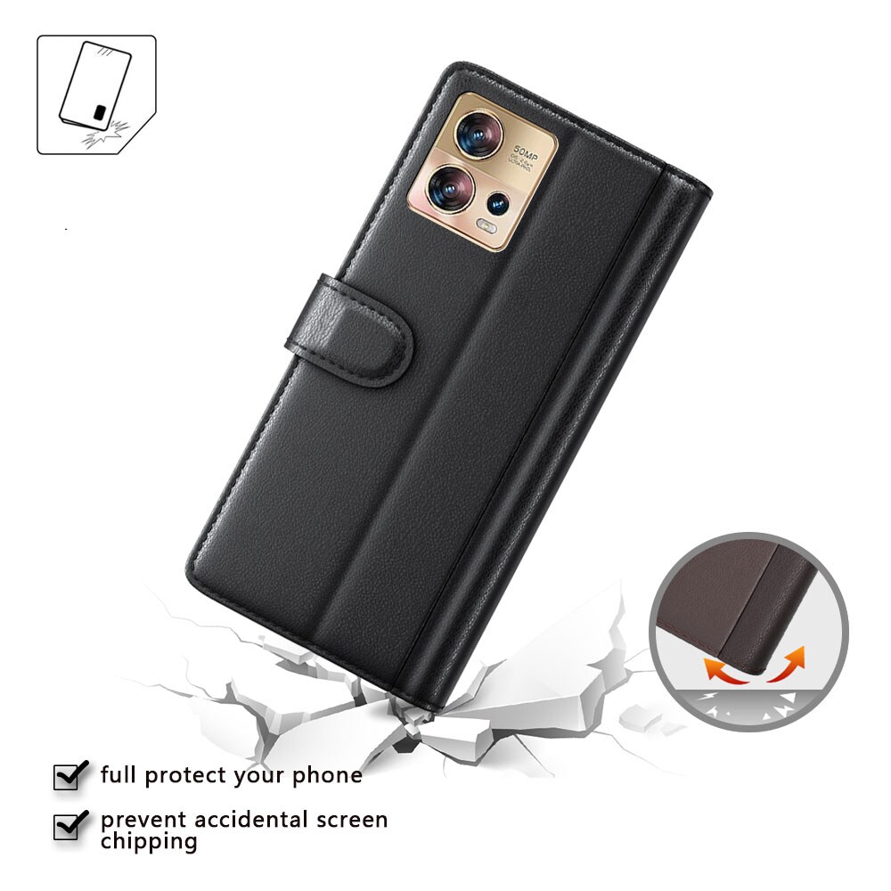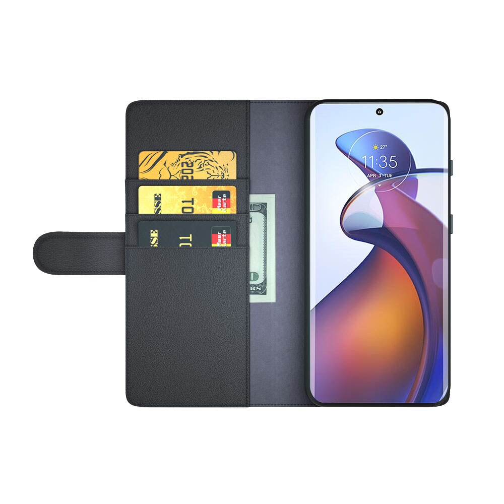 Bookcover hoesje van echt leer voor de Motorola Edge 30 Fusion Het hoesje beschermt je hele telefoon en heeft plek voor pasjes aan de binnenkant van de voorflap. De pasjeshouder heeft drie vakken en een groter vakje voor briefgeld of bonnetjes.