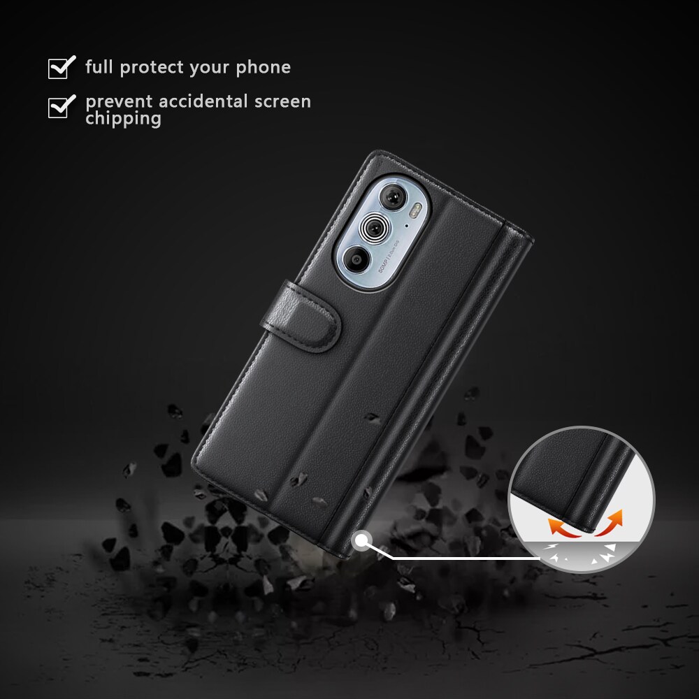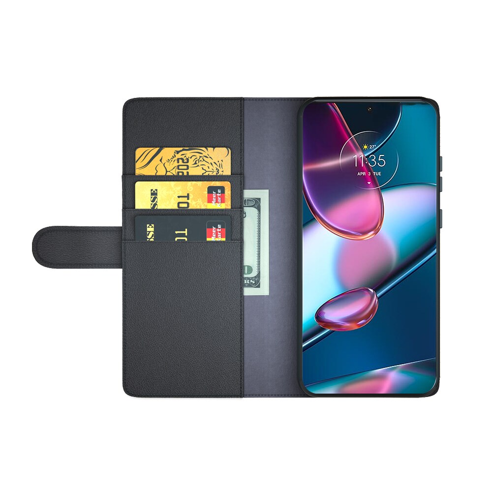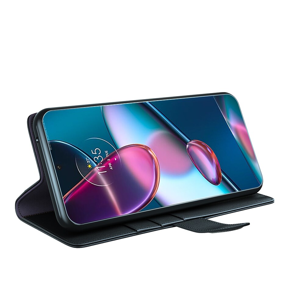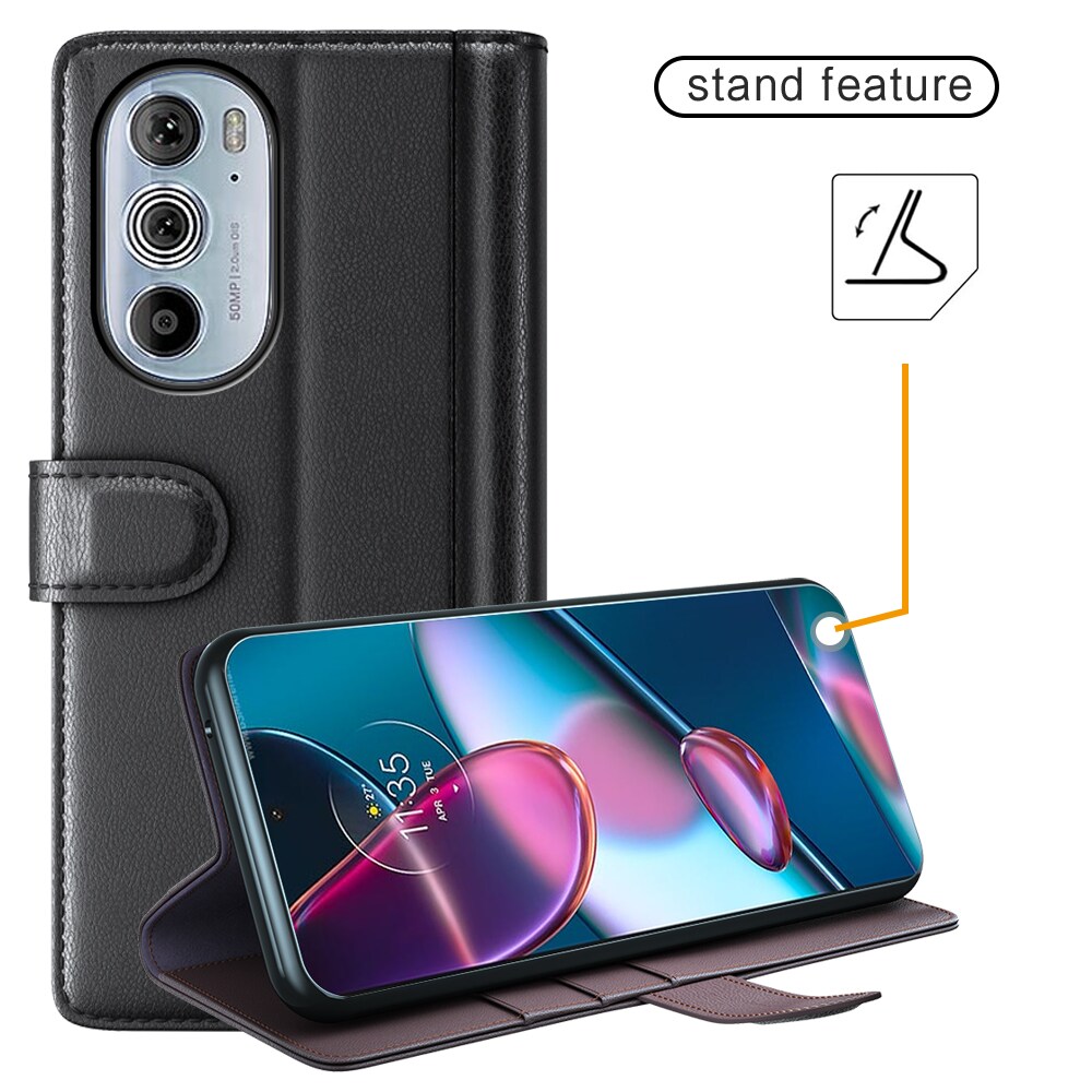 Bookcover hoesje van echt leer voor de Motorola Edge 30 Pro Het hoesje beschermt je hele telefoon en heeft plek voor pasjes aan de binnenkant van de voorflap. De pasjeshouder heeft drie vakken en een groter vakje voor briefgeld of bonnetjes.