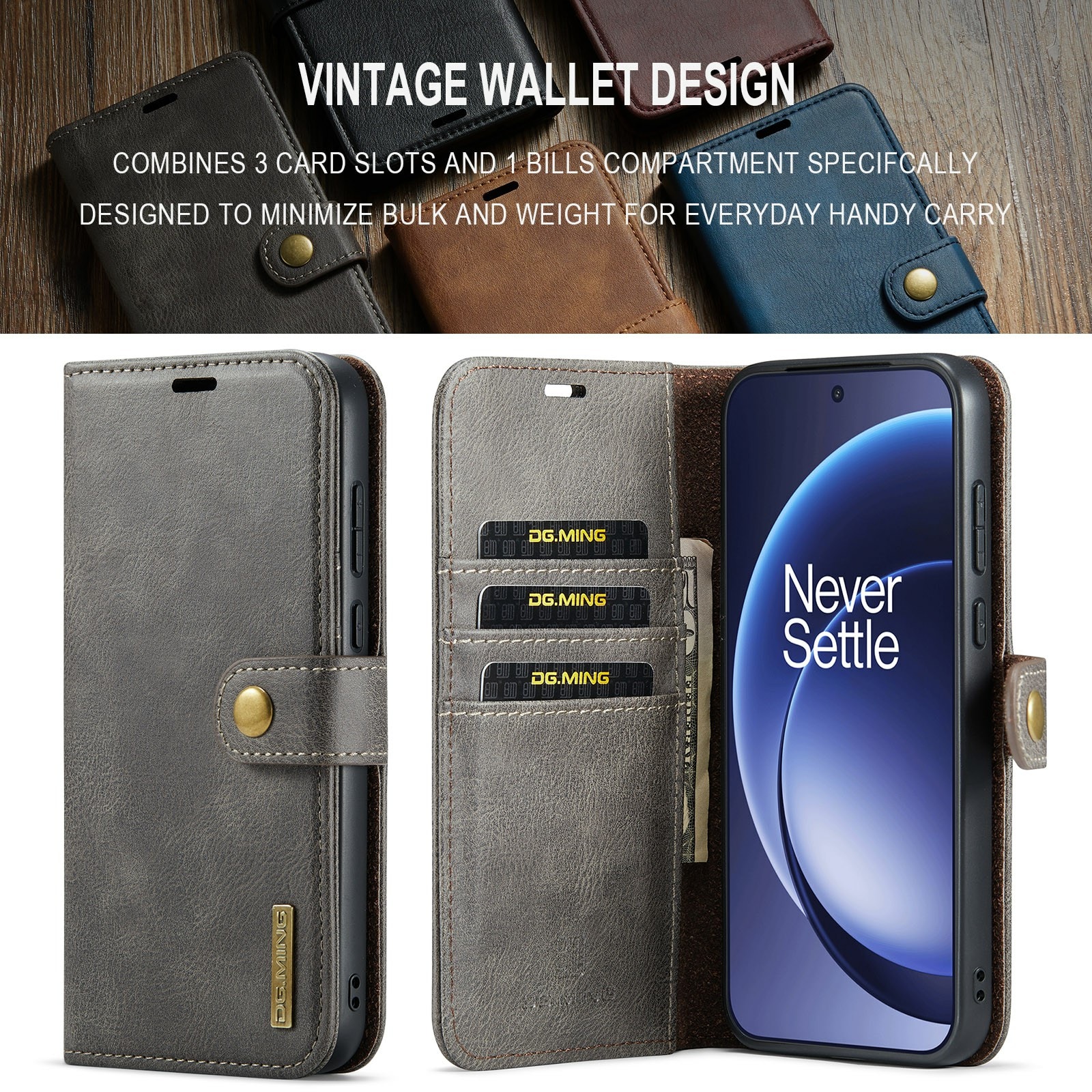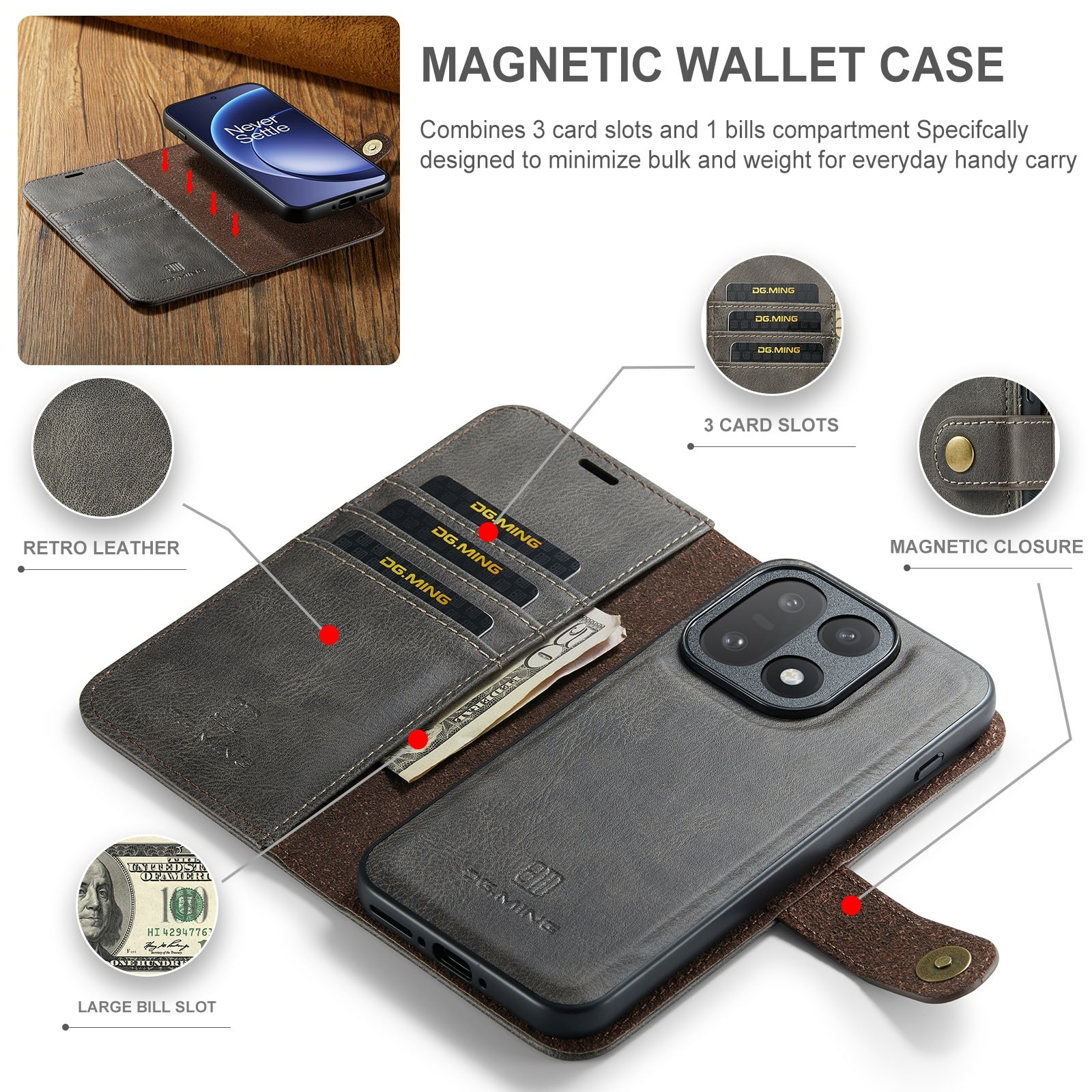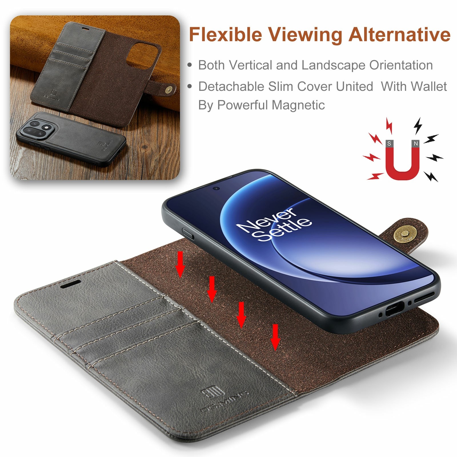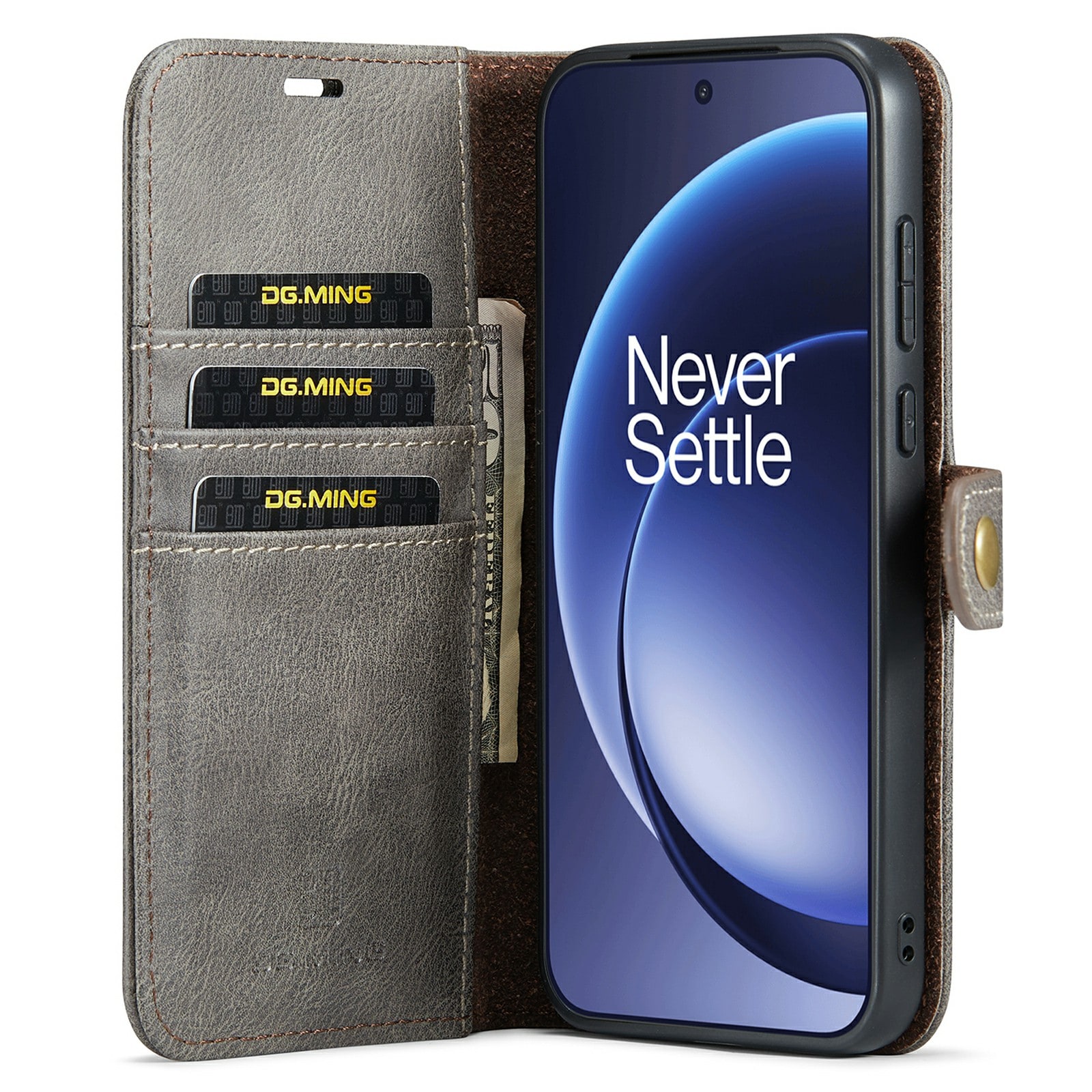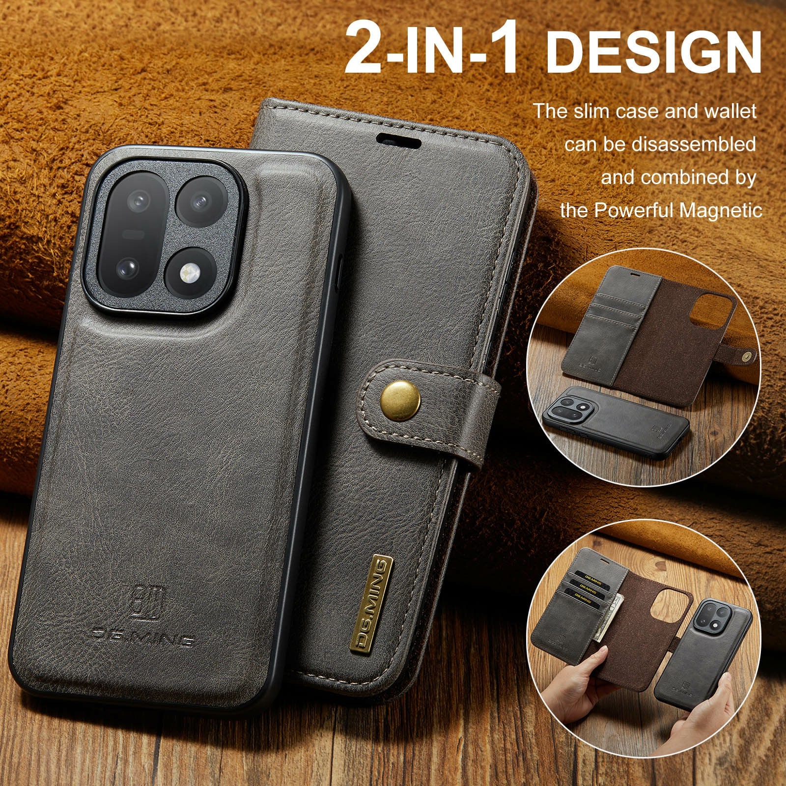 2-in-1-hoesje bestaande uit een bookcoverhoesje met daarin een afneembare magneet-backcase voor OnePlus 15 van DG.MING. Het hoesje heeft een klassieke en stijlvolle uitstraling. Eenvoudig losnemen van je telefoon in het backcover hoesje om enkel je mobiel te gebruiken, bijvoorbeeld thuis of op werk.