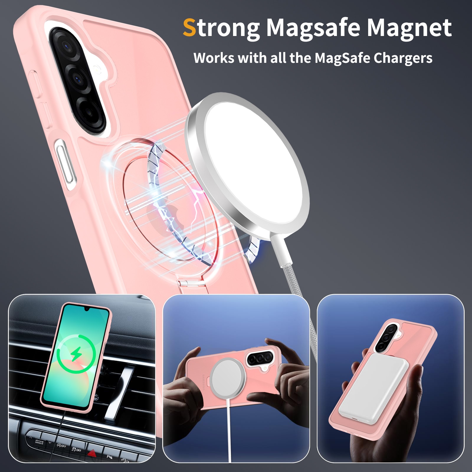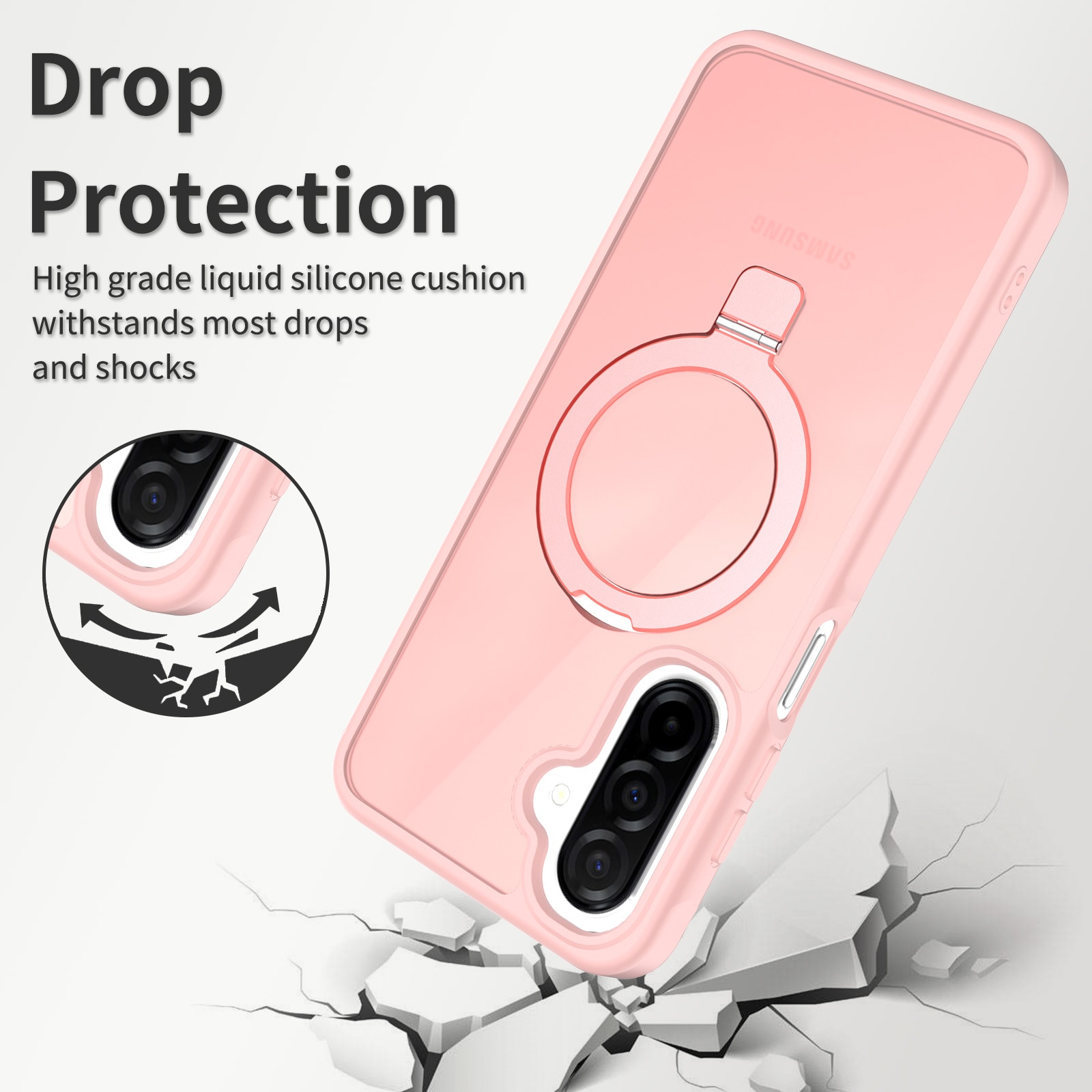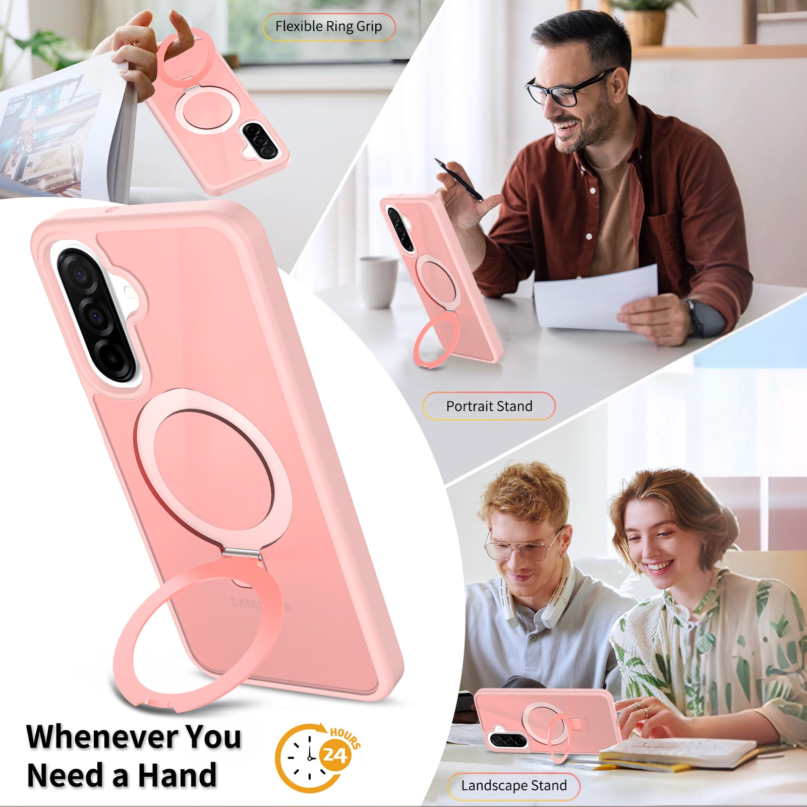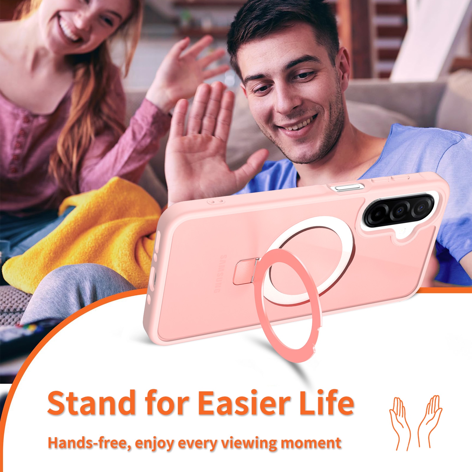 Hybride backcase met uitvouwbare magnetische ring voor Samsung Galaxy A16. Voor de beste bescherming van je telefoon is dit hybride hoesje tweeledig en bestaat uit een kern van TPU-siliconen en een buitenkant van plastic. De magnetische ring op de achterkant kan gebruikt worden met MagSafe-compatibele accessoires zoals laders en pasjeshouders. De ring kan tevens uitgevouwen worden tot een standaard om naar filmpjes of YouTube te kijken.