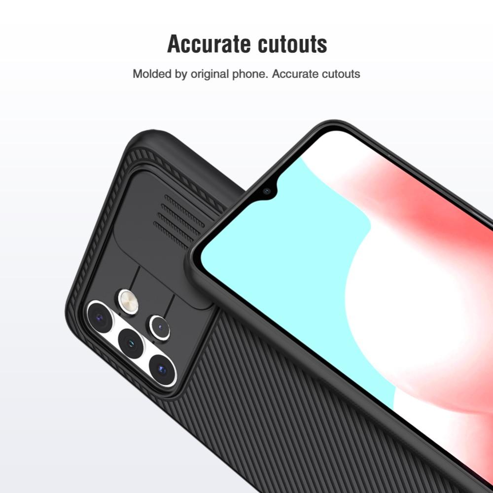 Backcoverhoesje van Nillkin met camerabescherming in stijlvol ontwerp voor Samsung Galaxy A32 5G. Om de camera van je telefoon te beschermen tegen krassen en beschadigingen heeft het hoesje een schuifje dat gemakkelijk voor de camera schuift wanneer je deze niet gebruikt.
