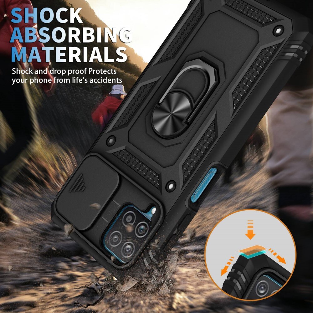 Hoesje met Camera Protector voor Samsung Galaxy A42 5G. Voor optimale bescherming tegen stoten en vallen heeft het hoesje een driedelige constructie met een TPU-kern, een harde kunststof buitenlaag en een beschermende rand rond het scherm. De ring aan de achterkant kan worden uitgeklapt om extra grip te geven op je telefoon. De ring kan ook worden gebruikt als standaard om films, video’s of games te bekijken.