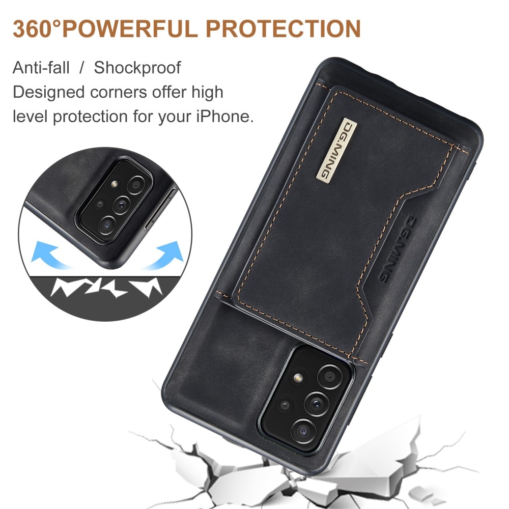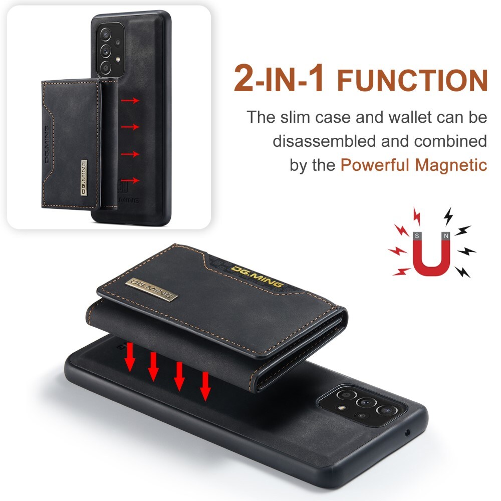Leren hoesje voor Samsung Galaxy A52 5G met bijbehorende portemonnee. De portemonnee wordt met magneten aan de achterkant van het hoesje bevestigd en kan eenvoudig worden verwijderd wanneer je deze niet nodig hebt. Door de portemonnee uit te klappen, kan deze ook worden gebruikt als standaard, zodat je gemakkelijk films of video’s kunt bekijken.