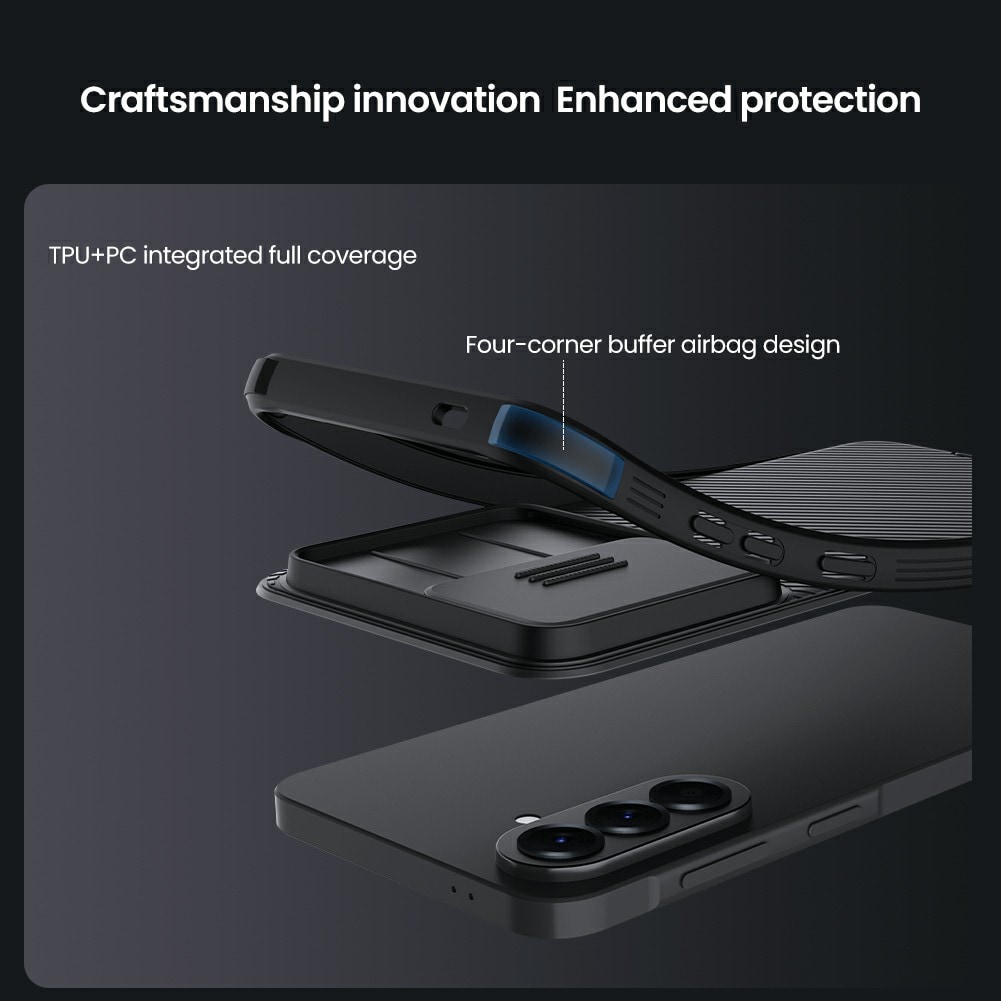 Backcoverhoesje van Nillkin met camerabescherming en MagSafe in stijlvol ontwerp voor Samsung Galaxy A57. Om de camera van je telefoon te beschermen tegen krassen en beschadigingen heeft het hoesje een schuifje dat gemakkelijk voor de camera schuift wanneer je deze niet gebruikt.
