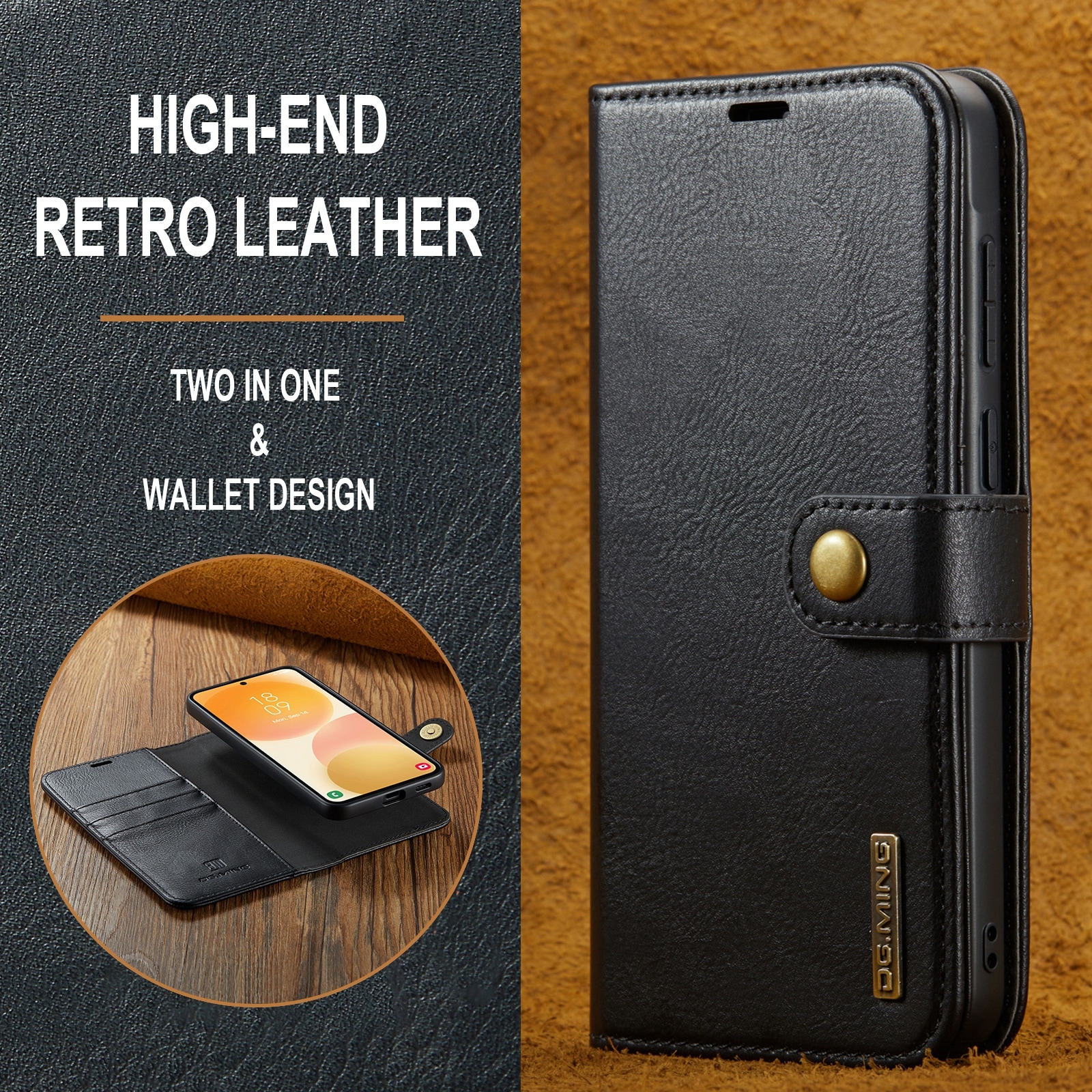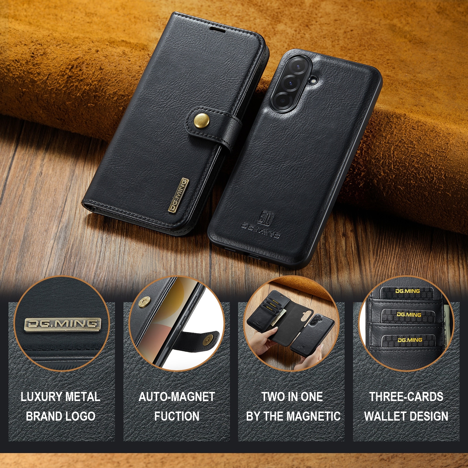 2-in-1-hoesje bestaande uit een bookcoverhoesje met daarin een afneembare magneet-backcase voor Samsung Galaxy A57 van DG.MING. Het hoesje heeft een klassieke en stijlvolle uitstraling. Eenvoudig losnemen van je telefoon in het backcover hoesje om enkel je mobiel te gebruiken, bijvoorbeeld thuis of op werk.