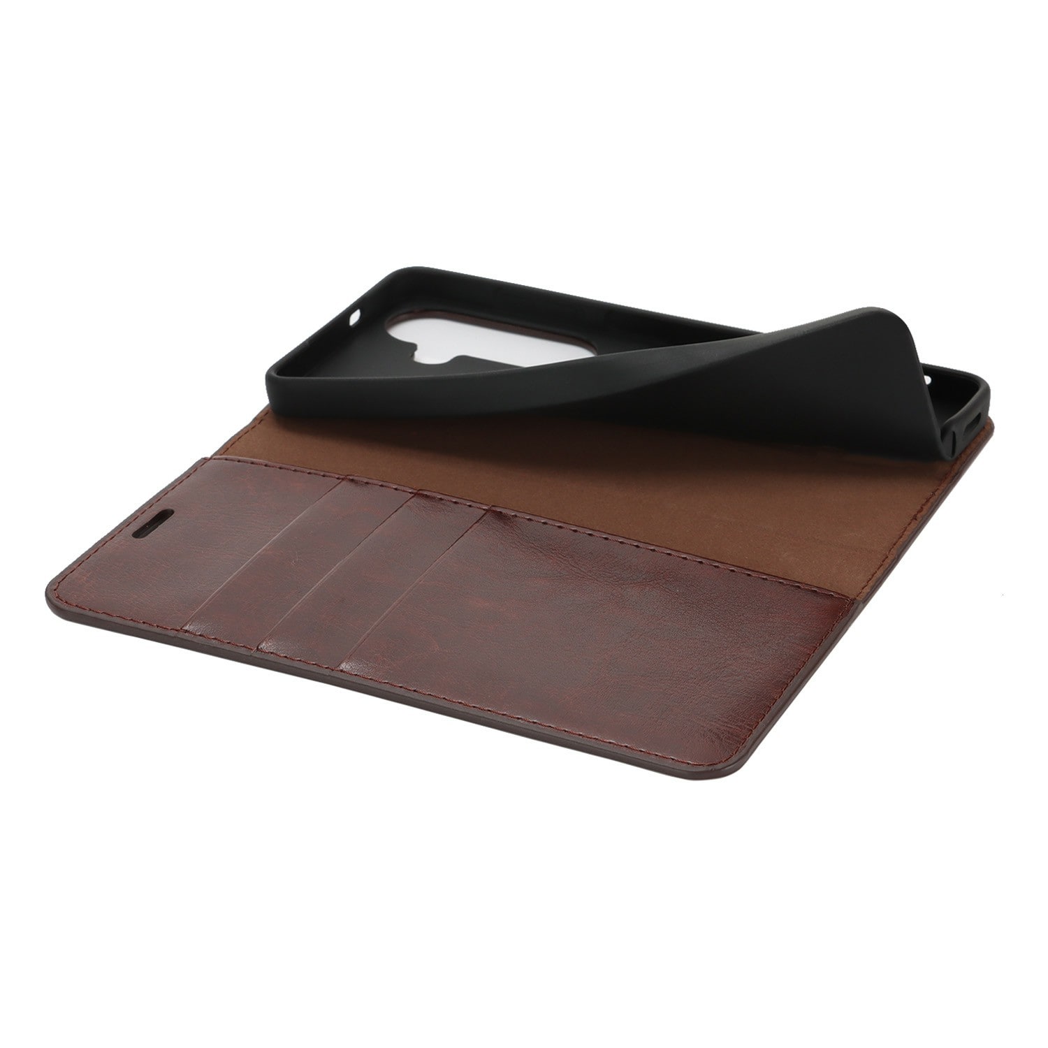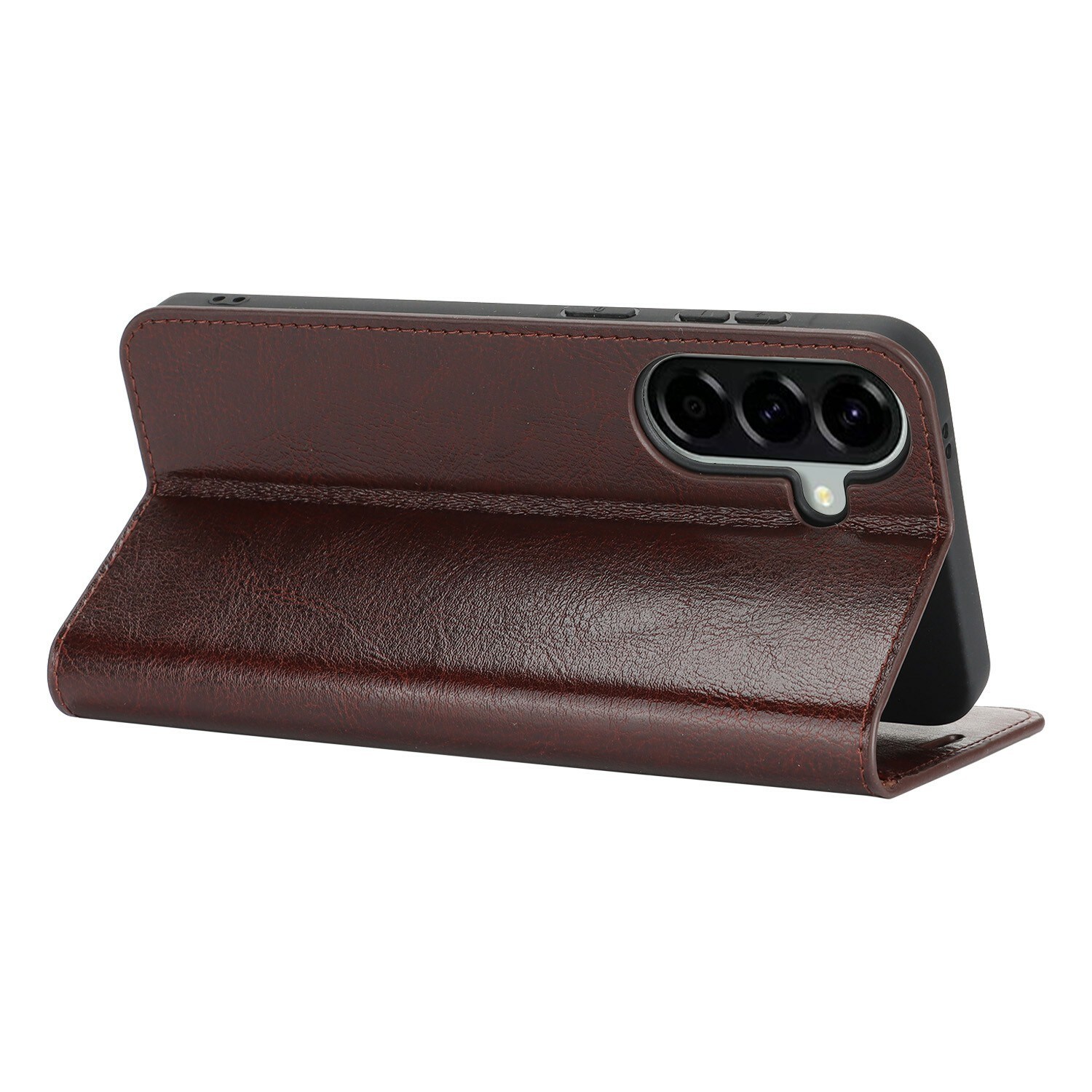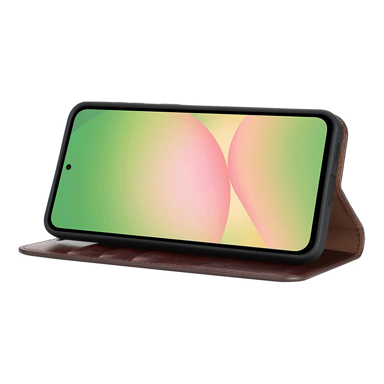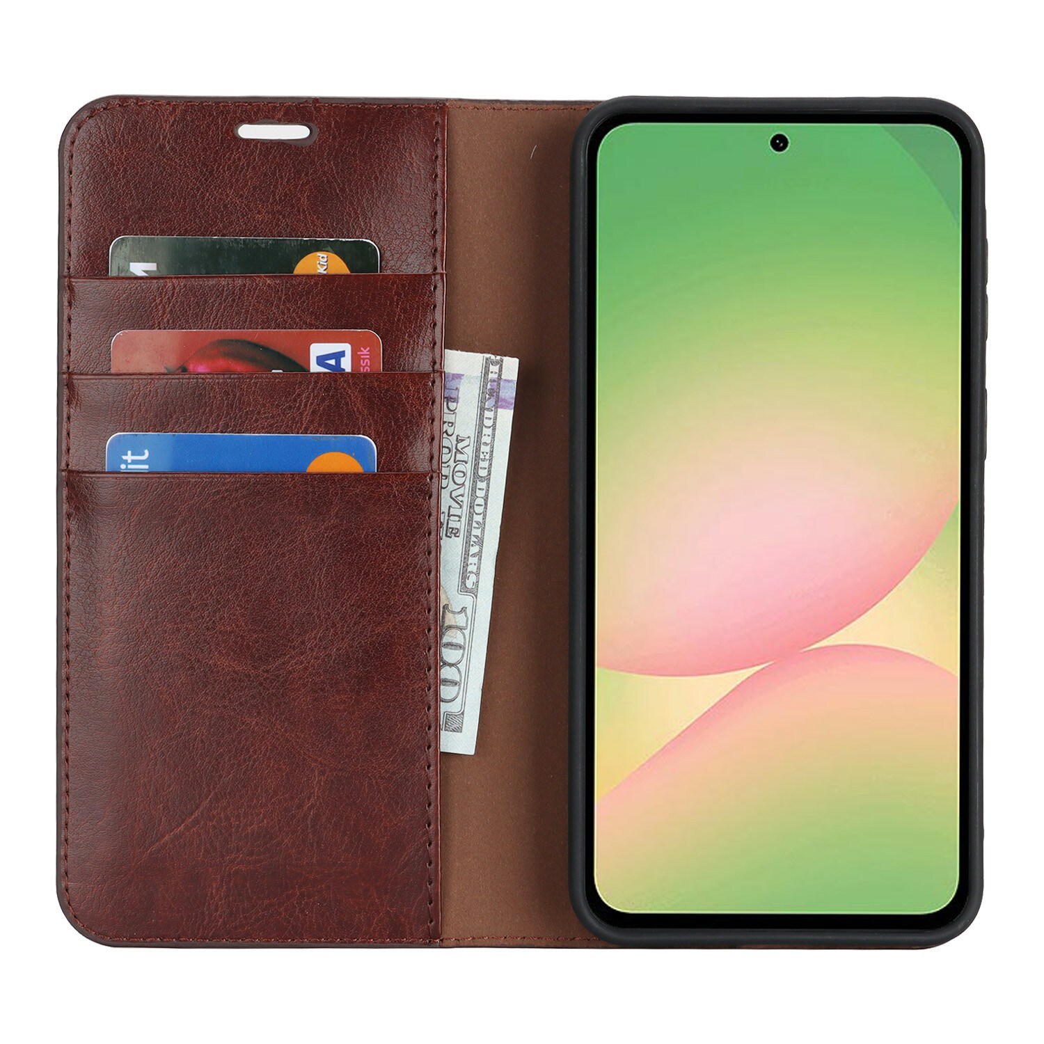 Bescherm je Samsung Galaxy A57 met een hoesje van echt leer. Ondanks het dunne en slimme design heeft het hoesje drie vakjes voor pasjes en één vakje voor briefgeld aan de binnenkant van de voorflap. Je telefoon zit veilig in de flexibele houder binnenin het hoesje.