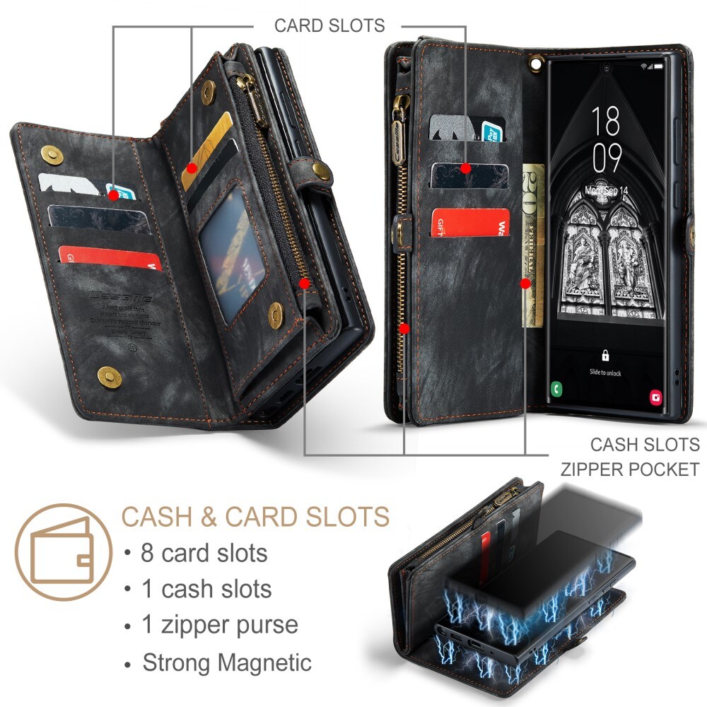 Telefoonhoesje met magnetische case en portemonnee met extra veel kaartsleuven voor Samsung Galaxy S23 Ultra van CaseMe. De ruime portemonnee heeft een vak voor bankbiljetten, een muntvak met ritssluiting en meerdere kaartsleuven.
