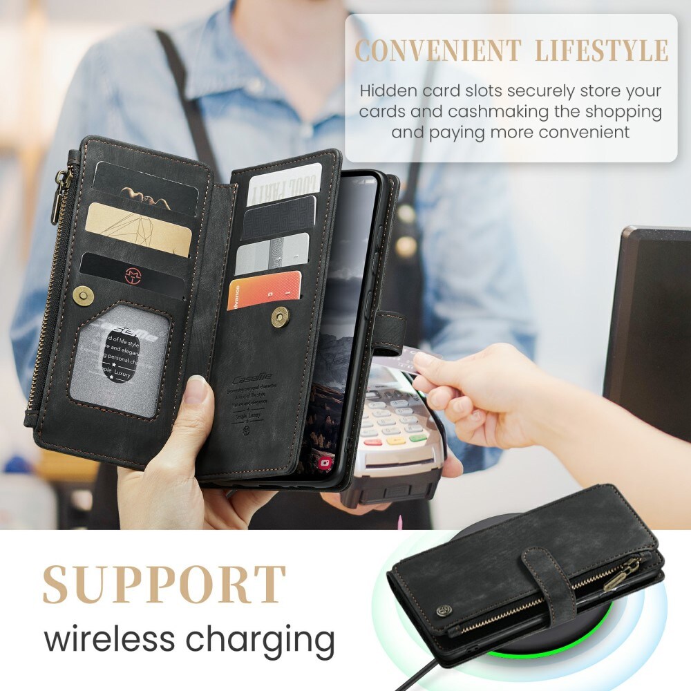 Bookcover hoesje voor Samsung Galaxy S24 Plus van CaseMe. De portemonnee beschikt over 7 kaarthouders, een vak voor briefgeld en een ruim muntvak met ritssluiting.