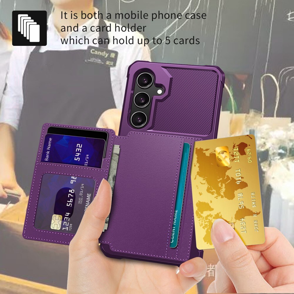 Schokabsorberend backcase hoesje voor de Samsung Galaxy S25 met ingebouwde portemonnee aan de achterkant. Het hoesje heeft een modern design en verstevigde hoeken voor de beste bescherming.
