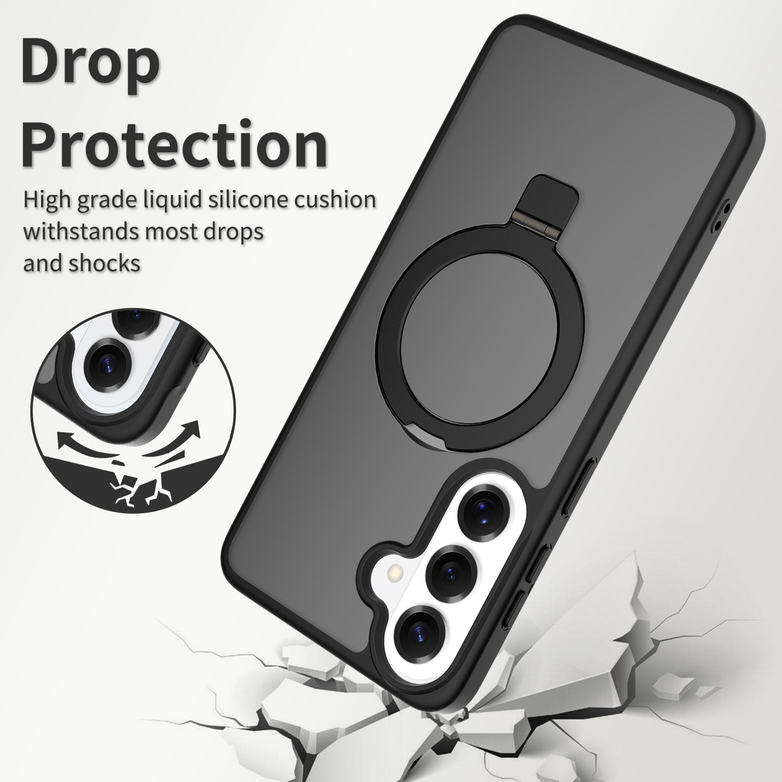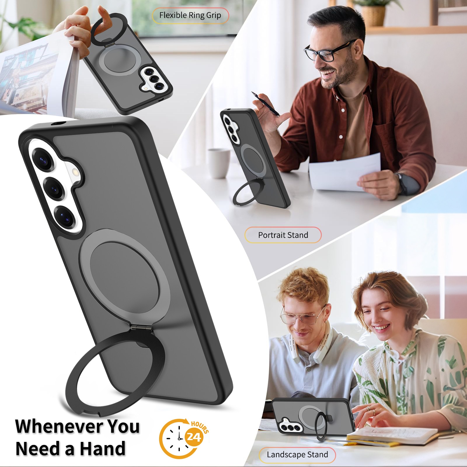 Hybride backcase met uitvouwbare magnetische ring voor Samsung Galaxy S26 Plus. Voor de beste bescherming van je telefoon is dit hybride hoesje tweeledig en bestaat uit een kern van TPU-siliconen en een buitenkant van plastic. De magnetische ring op de achterkant kan gebruikt worden met MagSafe-compatibele accessoires zoals laders en pasjeshouders. De ring kan tevens uitgevouwen worden tot een standaard om naar filmpjes of YouTube te kijken.