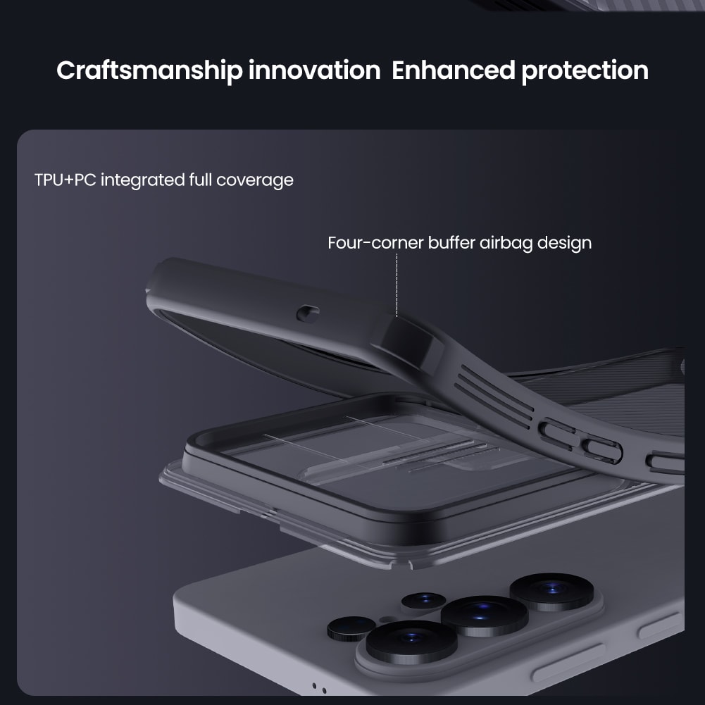 Backcoverhoesje van Nillkin met camerabescherming in stijlvol ontwerp voor Samsung Galaxy S26 Ultra. Om de camera van je telefoon te beschermen tegen krassen en beschadigingen heeft het hoesje een schuifje dat gemakkelijk voor de camera schuift wanneer je deze niet gebruikt.