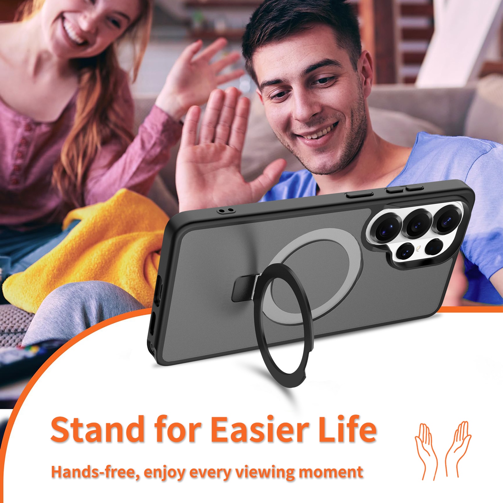 Hybride backcase met uitvouwbare magnetische ring voor Samsung Galaxy S26 Ultra. Voor de beste bescherming van je telefoon is dit hybride hoesje tweeledig en bestaat uit een kern van TPU-siliconen en een buitenkant van plastic. De magnetische ring op de achterkant kan gebruikt worden met MagSafe-compatibele accessoires zoals laders en pasjeshouders. De ring kan tevens uitgevouwen worden tot een standaard om naar filmpjes of YouTube te kijken.