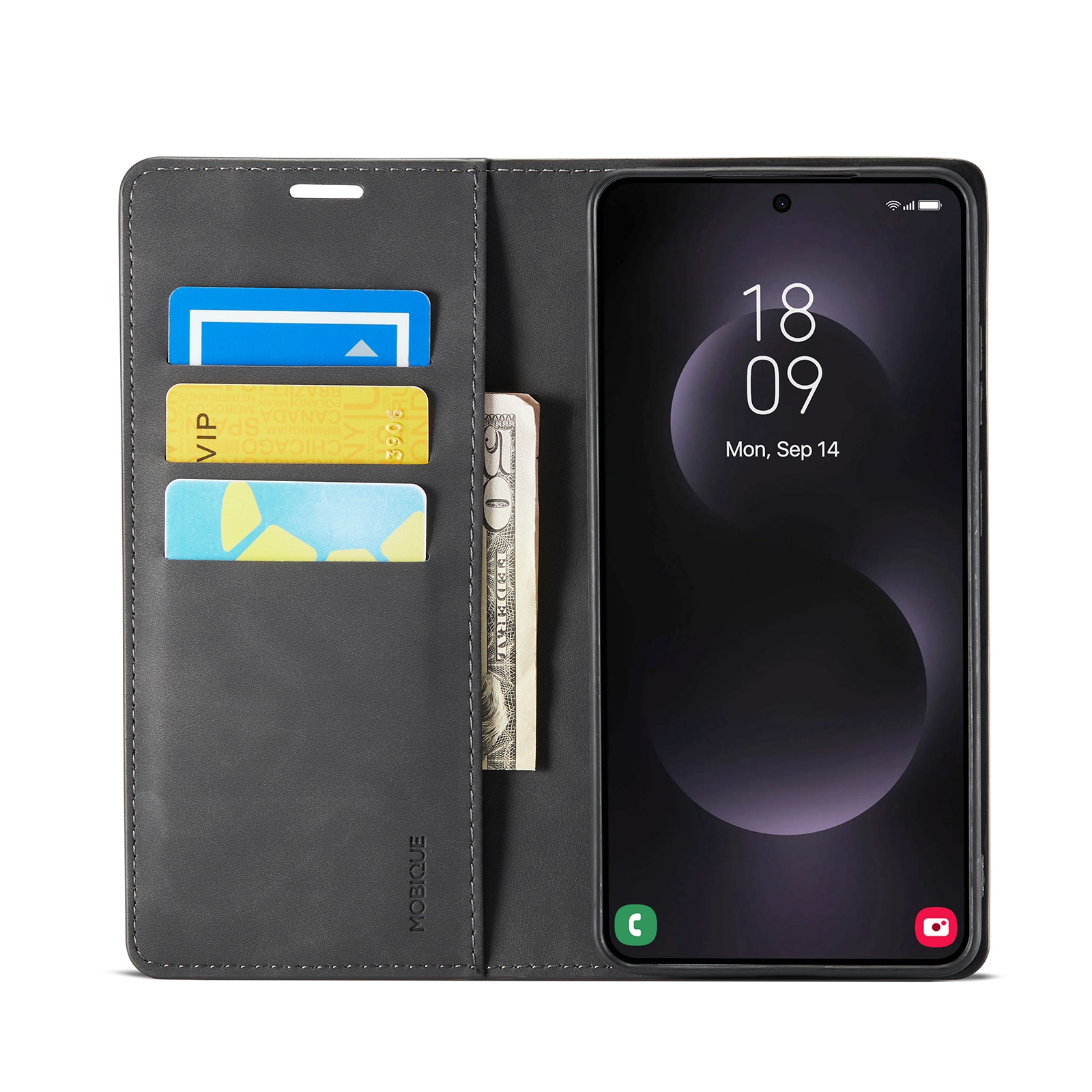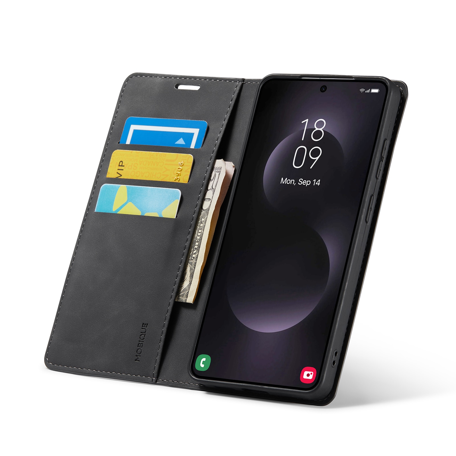 Aan de binnenkant van de flap bevinden zich kaartsleuven met ruimte voor maximaal twee kaarten. Daarnaast is er een vakje voor bonnetjes en briefgeld. Het hoesje blijft gesloten met discrete magneten die in de flap zijn verwerkt.