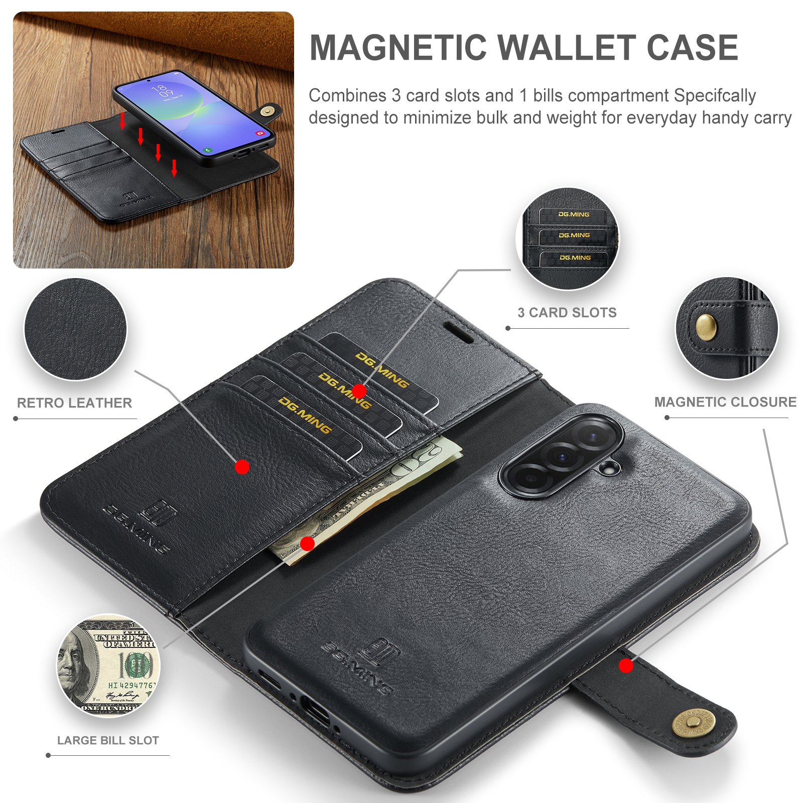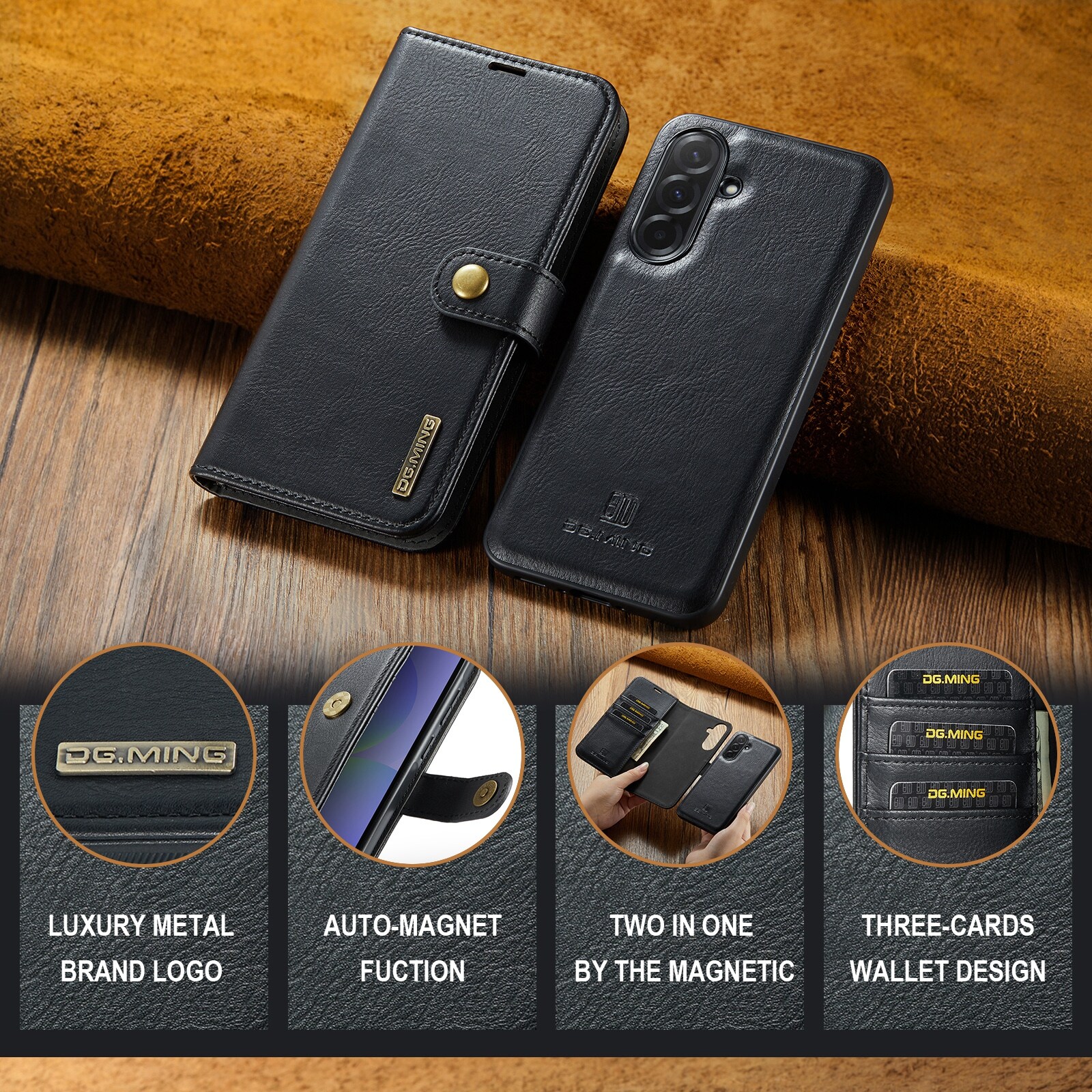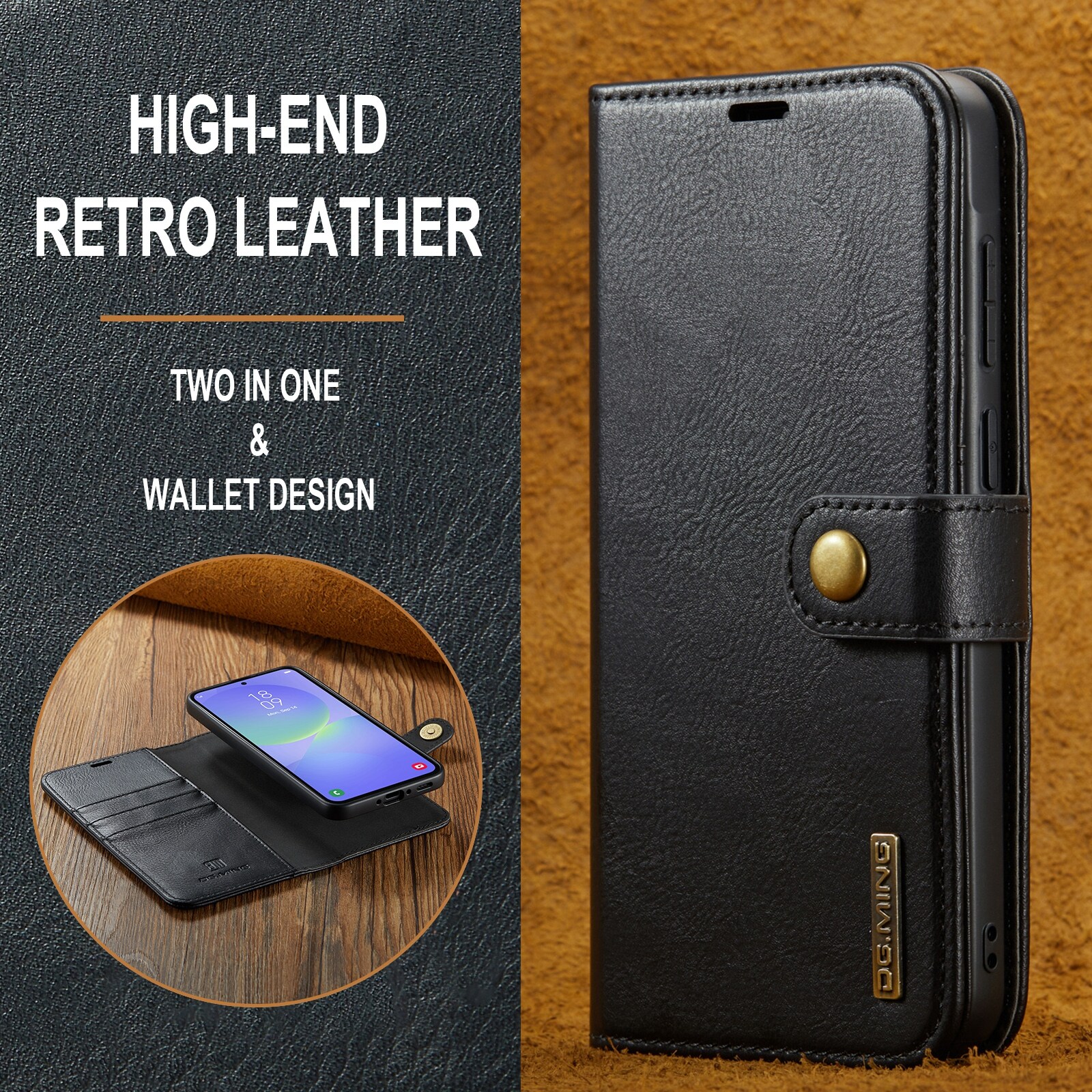 2-in-1-hoesje bestaande uit een bookcoverhoesje met daarin een afneembare magneet-backcase voor Samsung Galaxy A37 van DG.MING. Het hoesje heeft een klassieke en stijlvolle uitstraling. Eenvoudig losnemen van je telefoon in het backcover hoesje om enkel je mobiel te gebruiken, bijvoorbeeld thuis of op werk.