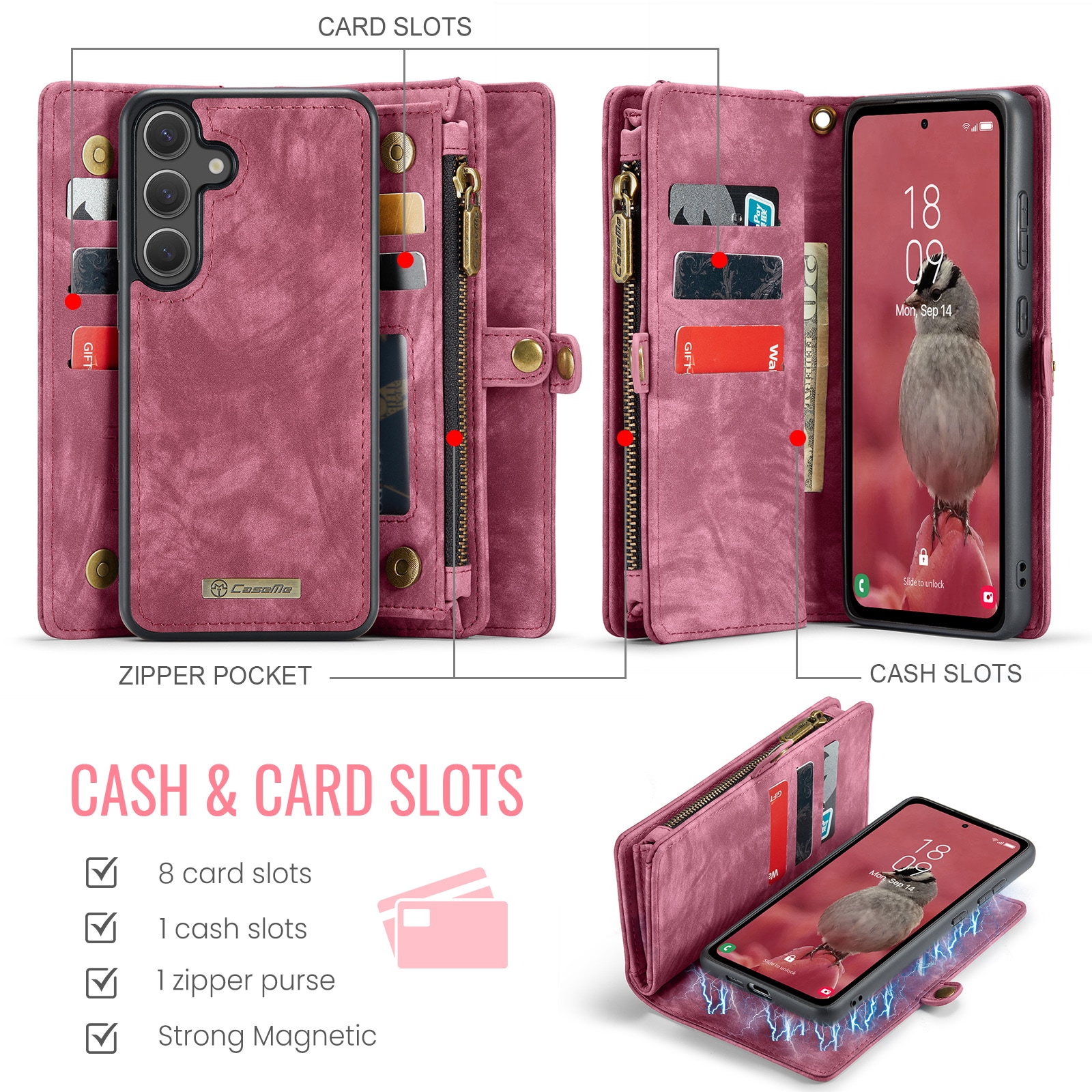 Telefoonhoesje met magnetische case en portemonnee met extra veel kaartsleuven voor Samsung Galaxy S26 van CaseMe. De ruime portemonnee heeft een vak voor bankbiljetten, een muntvak met ritssluiting en meerdere kaartsleuven.